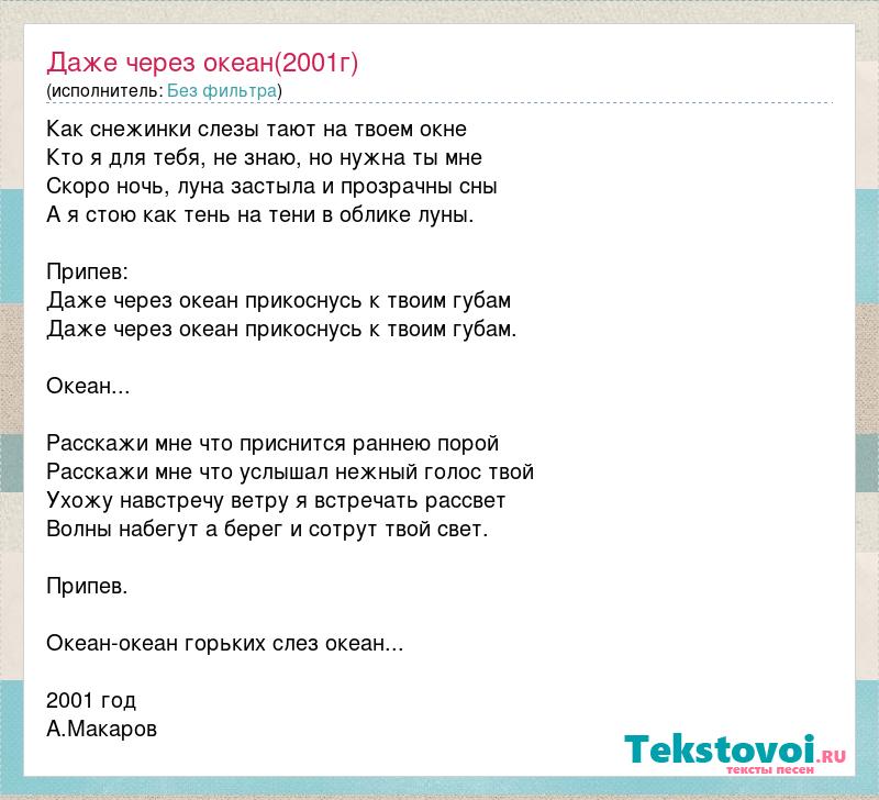 Как снежинки слезы тают на твоем окне Кто я для тебя, не знаю, но нужна ты мне Скоро ночь, луна застыла и прозрачны сны А я стою как тень на тени в облике луны. Припев: Даже через океан прикоснусь к твоим губам Даже через океан прикоснусь к твоим губам. Океан... Расскажи мне что приснится раннею порой Расскажи мне что услышал нежный голос твой Ухожу навстречу ветру я встречать рассвет Волны набегут а берег и сотрут твой свет. Припев. Океан-океан горьких слез океан... 2001 год А.Макаров