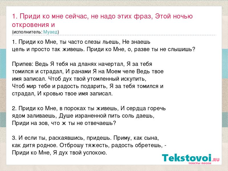 1. Приди ко Мне, ты часто слезы льешь, Не знаешь цель и просто так живешь. Приди ко Мне, о, разве ты не слышишь? Припев: Ведь Я тебя на дланях начертал, Я за тебя томился и страдал, И ранами Я на Моем челе Ведь твое имя записал. Чтоб дух твой утомленный искупить, Чтоб мир тебе и радость подарить, Я за тебя томился и страдал, И кровью твое имя записал. 2. Приди ко Мне, в пороках ты живешь, И сердца горечь ядом заливаешь, Душе израненной пить соль даешь, Приди на зов, что ж ты не отвечаешь? 3. И если ты, раскаявшись, придешь. Приму, как сына, как дитя родное. Отброшу тяжесть, радость обретешь, - Приди ко Мне, Я дух твой успокою.