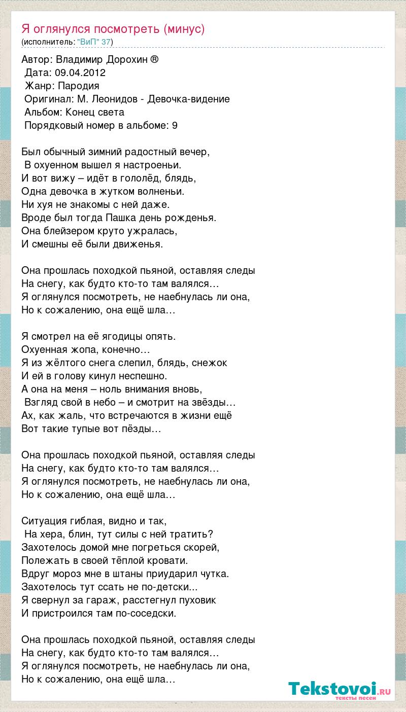Автор: Владимир Дорохин ® Дата: 09.04.2012 Жанр: Пародия Оригинал: М. Леонидов - Девочка-видение Альбом: Конец света Порядковый номер в альбоме: 9 Был обычный зимний радостный вечер, В охуенном вышел я настроеньи. И вот вижу – идёт в гололёд, блядь, Одна девочка в жутком волненьи. Ни хуя не знакомы с ней даже. Вроде был тогда Пашка день рожденья. Она блейзером круто ужралась, И смешны её были движенья. Она прошлась походкой пьяной, оставляя следы На снегу, как будто кто-то там валялся… Я оглянулся посмотреть, не наебнулась ли она, Но к сожалению, она ещё шла… Я смотрел на её ягодицы опять. Охуенная жопа, конечно… Я из жёлтого снега слепил, блядь, снежок И ей в голову кинул неспешно. А она на меня – ноль внимания вновь, Взгляд свой в небо – и смотрит на звёзды… Ах, как жаль, что встречаются в жизни ещё Вот такие тупые вот пёзды… Она прошлась походкой пьяной, оставляя следы На снегу, как будто кто-то там валялся… Я оглянулся посмотреть, не наебнулась ли она, Но к сожалению, она ещё шла… Ситуация гиблая, видно и так, На хера, блин, тут силы с ней тратить? Захотелось домой мне погреться скорей, Полежать в своей тёплой кровати. Вдруг мороз мне в штаны приударил чутка. Захотелось тут ссать не по-детски... Я свернул за гараж, расстегнул пуховик И пристроился там по-соседски. Она прошлась походкой пьяной, оставляя следы На снегу, как будто кто-то там валялся… Я оглянулся посмотреть, не наебнулась ли она, Но к сожалению, она ещё шла…