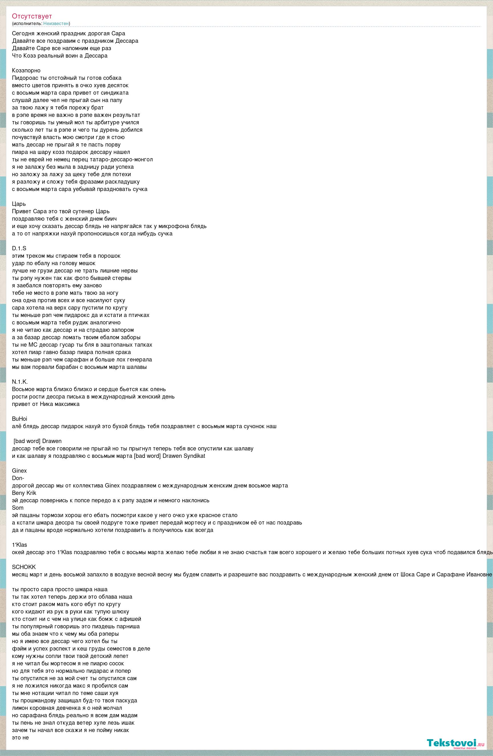 Сегодня женский праздник дорогая Сара Давайте все поздравим с праздником Дессара Давайте Саре все напомним еще раз Что Козз реальный воин а Дессара Коззпорно Пидороас ты отстойный ты готов собака вместо цветов принять в очко хуев десяток с восьмым марта сара привет от синдиката слушай далее чел не прыгай сын на папу за твою лажу я тебя порежу брат в рэпе время не важно в рэпе важен результат ты говоришь ты умный мол ты арбитуре учился сколько лет ты в рэпе и чего ты дурень добился почувствуй власть мою смотри где я стою мать дессар не прыгай я те пасть порву пиара на шару козз подарок дессару нашел ты не еврей не немец перец татаро-дессаро-монгол я не залажу без мыла в задницу ради успеха но заложу за лажу за щеку тебе для потехи я разложу и сложу тебя фразами раскладушку с восьмым марта сара уебывай праздновать сучка Царь Привет Сара это твой сутенер Царь поздравляю тебя с женский днем биич и еще хочу сказать дессар блядь не напрягайся так у микрофона блядь а то от напряжки нахуй пропоносишься когда нибудь сучка D.1.S этим треком мы стираем тебя в порошок удар по ебалу на голову мешок лучше не грузи дессар не трать лишние нервы ты рэпу нужен так как фото бывшей стервы я заебался повторять ему заново тебе не место в рэпе мать твою за ногу она одна против всех и все насилуют суку сара хотела на верх сару пустили по кругу ты меньше рэп чем пидарокс да и кстати а птичках с восьмым марта тебя рудик аналогично я не читаю как дессар и на страдаю запором а за базар дессар ломать твоим ебалом заборы ты не МС дессар гусар ты бля в заштопаных тапках хотел пиар гавно базар пиара полная срака ты меньше рэп чем сарафан и больше лох генерала мы вам порвали барабан с восьмым марта шалавы N.1.K. Восьмое марта близко близко и сердце бьется как олень рости рости дессра писька в международный женский день привет от Ника максимка BuHoi алё блядь дессар пидарок нахуй это бухой блядь тебя поздравляет с восьмым марта сучонок наш [bad word] Drawen дессар тебе все говорили не прыгай но ты прыгнул теперь тебя все опустили как шалаву и как шалаву я поздравляю с восьмым марта [bad word] Drawen Syndikat Ginex Don- дорогой дессар мы от коллектива Ginex поздравляем с международным женским днем восьмое марта Beny Krik эй дессар повернись к попсе передо а к рэпу задом и немного наклонись Som эй пацаны тормози хорош его ебать посмотри какое у него очко уже красное стало а кстати шмара дессра ты своей подруге тоже привет передай мортесу и с праздником её от нас поздравь да и пацаны вроде нормально хотели поздравить а получилось как всегда 1'Klas окей дессар это 1'Klas поздравляю тебя с восьмы марта желаю тебе любви я не знаю счастья там всего хорошего и желаю тебе больших потных хуев сука чтоб подавился блядь SCHOKK месяц март и день восьмой запахло в воздухе весной весну мы будем славить и разрешите вас поздравить с международным женский днем от Шока Саре и Сарафане Ивановне ты просто сара просто шмара наша ты так хотел теперь держи это облава наша кто стоит раком мать кого ебут по кругу кого кидают из рук в руки как тупую шлюху кто стоит ни с чем на улице как бомж с афишей ты популярный говоришь это пиздешь парниша мы оба знаем что к чему мы оба рэперы но я имею все дессар чего хотел бы ты фэйм и успех рэспект и кеш груды семестов в деле кому нужны сопли твои твой детский лепет я не читал бы мортесом я не пиарю сосок но д