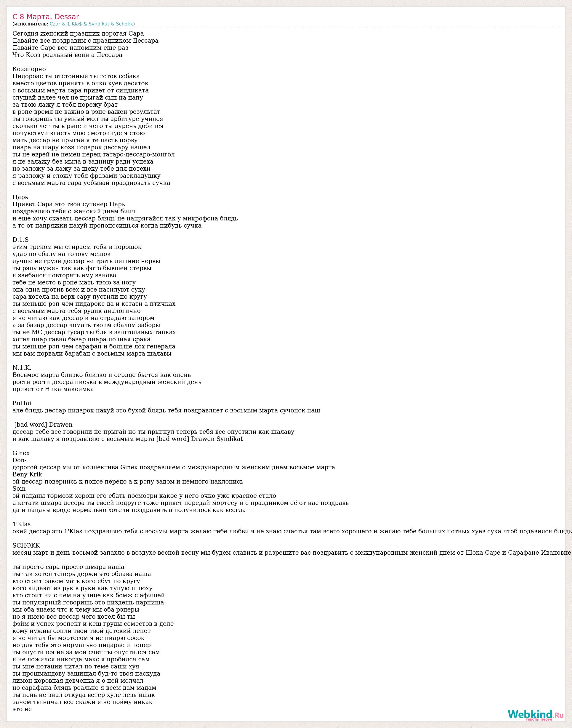Сегодня женский праздник дорогая Сара Давайте все поздравим с праздником Дессара Давайте Саре все напомним еще раз Что Козз реальный воин а Дессара Коззпорно Пидороас ты отстойный ты готов собака вместо цветов принять в очко хуев десяток с восьмым марта сара привет от синдиката слушай далее чел не прыгай сын на папу за твою лажу я тебя порежу брат в рэпе время не важно в рэпе важен результат ты говоришь ты умный мол ты арбитуре учился сколько лет ты в рэпе и чего ты дурень добился почувствуй власть мою смотри где я стою мать дессар не прыгай я те пасть порву пиара на шару козз подарок дессару нашел ты не еврей не немец перец татаро-дессаро-монгол я не залажу без мыла в задницу ради успеха но заложу за лажу за щеку тебе для потехи я разложу и сложу тебя фразами раскладушку с восьмым марта сара уебывай праздновать сучка Царь Привет Сара это твой сутенер Царь поздравляю тебя с женский днем биич и еще хочу сказать дессар блядь не напрягайся так у микрофона блядь а то от напряжки нахуй пропоносишься когда нибудь сучка D.1.S этим треком мы стираем тебя в порошок удар по ебалу на голову мешок лучше не грузи дессар не трать лишние нервы ты рэпу нужен так как фото бывшей стервы я заебался повторять ему заново тебе не место в рэпе мать твою за ногу она одна против всех и все насилуют суку сара хотела на верх сару пустили по кругу ты меньше рэп чем пидарокс да и кстати а птичках с восьмым марта тебя рудик аналогично я не читаю как дессар и на страдаю запором а за базар дессар ломать твоим ебалом заборы ты не МС дессар гусар ты бля в заштопаных тапках хотел пиар гавно базар пиара полная срака ты меньше рэп чем сарафан и больше лох генерала мы вам порвали барабан с восьмым марта шалавы N.1.K. Восьмое марта близко близко и сердце бьется как олень рости рости дессра писька в международный женский день привет от Ника максимка BuHoi алё блядь дессар пидарок нахуй это бухой блядь тебя поздравляет с восьмым марта сучонок наш [bad word] Drawen дессар тебе все говорили не прыгай но ты прыгнул теперь тебя все опустили как шалаву и как шалаву я поздравляю с восьмым марта [bad word] Drawen Syndikat Ginex Don- дорогой дессар мы от коллектива Ginex поздравляем с международным женским днем восьмое марта Beny Krik эй дессар повернись к попсе передо а к рэпу задом и немного наклонись Som эй пацаны тормози хорош его ебать посмотри какое у него очко уже красное стало а кстати шмара дессра ты своей подруге тоже привет передай мортесу и с праздником её от нас поздравь да и пацаны вроде нормально хотели поздравить а получилось как всегда 1'Klas окей дессар это 1'Klas поздравляю тебя с восьмы марта желаю тебе любви я не знаю счастья там всего хорошего и желаю тебе больших потных хуев сука чтоб подавился блядь SCHOKK месяц март и день восьмой запахло в воздухе весной весну мы будем славить и разрешите вас поздравить с международным женский днем от Шока Саре и Сарафане Ивановне ты просто сара просто шмара наша ты так хотел теперь держи это облава наша кто стоит раком мать кого ебут по кругу кого кидают из рук в руки как тупую шлюху кто стоит ни с чем на улице как бомж с афишей ты популярный говоришь это пиздешь парниша мы оба знаем что к чему мы оба рэперы но я имею все дессар чего хотел бы ты фэйм и успех рэспект и кеш груды семестов в деле кому нужны сопли твои твой детский лепет я не читал бы мортесом я не пиарю сосок но д