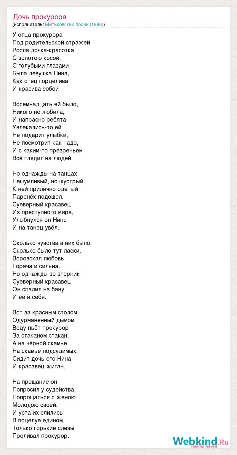 У отца прокурора Под родительской стражей Росла дочка-красотка С золотою косой. С голубыми глазами Была девушка Нина, Как отец горделива И красива собой Восемнадцать ей было, Никого не любила, И напрасно ребята Увлекались-то ей Не подарит улыбки, Не посмотрит как надо, И с каким-то презреньем Всё глядит на людей. Но однажды на танцах Нешумливый, но шустрый К ней прилично одетый Паренёк подошел. Суеверный красавец Из преступного мира, Улыбнулся он Нине И на танец увёл. Сколько чувства в них было, Сколько было тут ласки, Воровская любовь Горяча и сильна. Но однажды во вторник Суеверный красавец Он спалил на бану И её и себя. Вот за красным столом Одурманенный дымом Воду пьёт прокурор За стаканом стакан. А на чёрной скамье, На скамье подсудимых, Сидит дочь его Нина И красавец жиган. На прощание он Попросил у судейства, Попрощаться с женою Молодою своей. И уста их слились В поцелуе едином, Только горькие слёзы Проливал прокурор.