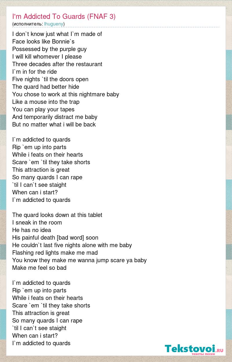I don`t know just what I`m made of Face looks like Bonnie`s Possessed by the purple guy I will kill whomever I please Three decades after the restaurant I`m in for the ride Five nights `til the doors open The quard had better hide You chose to work at this nightmare baby Like a mouse into the trap You can play your tapes And temporarily distract me baby But no matter what i will be back I`m addicted to quards Rip `em up into parts While i feats on their hearts Scare `em `til they take shorts This attraction is great So many quards I can rape `til I can`t see staight When can i start? I`m addicted to quards The quard looks down at this tablet I sneak in the room He has no idea His painful death [bad word] soon He couldn`t last five nights alone with me baby Flashing red lights make me mad You know they make me wanna jump scare ya baby Make me feel so bad I`m addicted to quards Rip `em up into parts While i feats on their hearts Scare `em `til they take shorts This attraction is great So many quards I can rape `til I can`t see staight When can i start? I`m addicted to quards