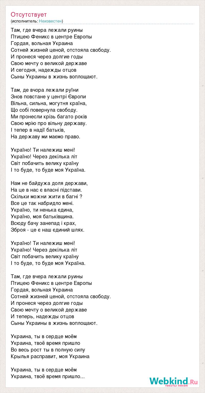 Там, где вчера лежали руины Птицею Феникс в центре Европы Гордая, вольная Украина Сотней жизней ценой, отстояла свободу. И пронеся через долгие годы Свою мечту о великой державе И сегодня, надежды отцов Сыны Украины в жизнь воплощают. Там, де вчора лежали руїни Знов повстане у центрі Європи Вільна, сильна, могутня країна, Що собі повернула свободу. Ми пронесли крізь багато років Свою мрію про вільну державу. І тепер в надії батьків, На державу ми маємо право. Україно! Ти належиш мені! Україно! Через декілька літ Світ побачить велику країну І то буде, то буде моя Україна. Нам не байдужа доля держави, На це в нас є власні підстави. Скільки можни жити в багні ? Все це так набридло мені. Україно, ти ненька єдина, Україно, моя батьківщина. Всюду бачу занепад і крах, Зброя - це є наш єдиний шлях. Україно! Ти належиш мені! Україно! Через декілька літ Світ побачить велику країну І то буде, то буде моя Україна. Там, где вчера лежали руины Птицею Феникс в центре Европы Гордая, вольная Украина Сотней жизней ценой, отстояла свободу. И пронеся через долгие годы Свою мечту о великой державе И теперь, надежды отцов Сыны Украины в жизнь воплощают. Украина, ты в сердце моём Украина, твоё время пришло Во весь рост ты в полную силу Крылья расправит, моя Украина Украина, ты в сердце моём Украина, твоё время пришло...