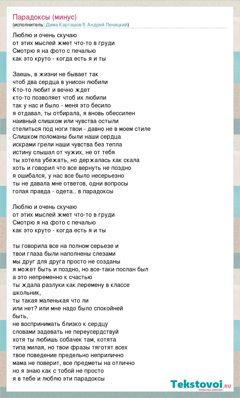 Люблю и очень скучаю от этих мыслей жмет что-то в груди Смотрю я на фото с печалью как это круто - когда есть я и ты Заешь, в жизни не бывает так чтоб два сердца в унисон любили Кто-то любит и вечно ждет кто-то позволяет чтоб их любили так у нас и было - меня это бесило я отдавал, ты отбирала, я вновь обессилен наивный слишком или чувства остыли стелиться под ноги твои - давно не в моем стиле Слишком поломаны были наши сердца искрами грели наши чувства без тепла истину слышал от чужих, не от тебя ты хотела убежать, но держалась как скала хоть и говорил что все вернуть не поздно я ошибался, у нас все было несерьезно ты не давала мне ответов, одни вопросы голая правда - одета.. в парадоксы Люблю и очень скучаю от этих мыслей жмет что-то в груди Смотрю я на фото с печалью как это круто - когда есть я и ты ты говорила все на полном серьезе и твои глаза были наполнены слезами мы друг для друга просто не созданы я может быть и поздно, но все-таки послан был а это непременно к счастью ты ждала разлуки как перемену в классе школьник, ты такая маленькая что ли или нет? или мне надо было спокойней быть, не воспринимать близко к сердцу словами задевать не переусердствуй хотя ты любишь собачек там, котята типа милая, но твои фразы тяготят всех твое поведение предельно неприлично мама не поверит, все предметы на отлично но я знаю как с тобой не просто я в тебе и люблю эти парадоксы