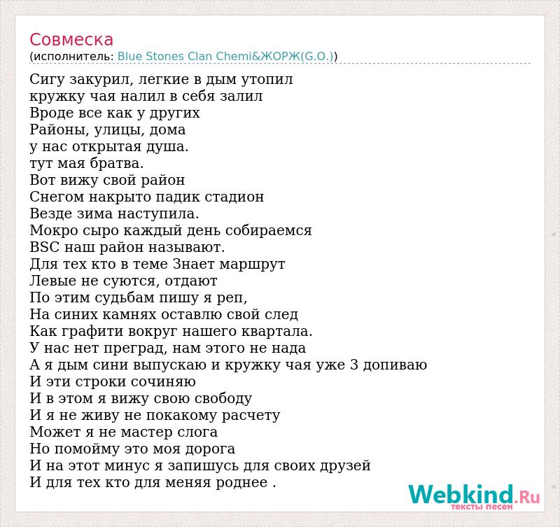 Сигу закурил, легкие в дым утопил кружку чая налил в себя залил Вроде все как у других Районы, улицы, дома у нас открытая душа. тут мая братва. Вот вижу свой район Снегом накрыто падик стадион Везде зима наступила. Мокро сыро каждый день собираемся BSC наш район называют. Для тех кто в теме Знает маршрут Левые не суются, отдают По этим судьбам пишу я реп, На синих камнях оставлю свой след Как графити вокруг нашего квартала. У нас нет преград, нам этого не нада А я дым сини выпускаю и кружку чая уже 3 допиваю И эти строки сочиняю И в этом я вижу свою свободу И я не живу не покакому расчету Может я не мастер слога Но помойму это моя дорога И на этот минус я запишусь для своих друзей И для тех кто для меняя роднее .