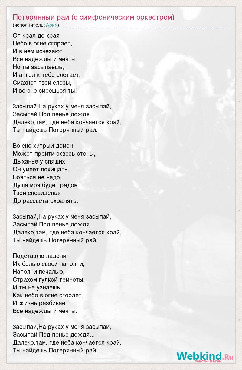От края до края Небо в огне сгорает, И в нем исчезают Все надежды и мечты. Но ты засыпаешь, И ангел к тебе слетает, Смахнет твои слезы, И во сне смеёшься ты! 3асыпай,На руках у меня засыпай, Засыпай Под пенье дождя... Далеко,там, где неба кончается край, Ты найдешь Потерянный рай. Во сне хитрый демон Может пройти сквозь стены, Дыханье у спящих Он умеет похищать. Бояться не надо, Душа моя будет рядом. Твои сновиденья До рассвета охранять. 3асыпай,На руках у меня засыпай, Засыпай Под пенье дождя... Далеко,там, где неба кончается край, Ты найдешь Потерянный рай. Подставлю ладони - Их болью своей наполни, Наполни печалью, Страхом гулкой темноты, И ты не узнаешь, Как небо в огне сгорает, И жизнь разбивает Все надежды и мечты. 3асыпай,На руках у меня засыпай, Засыпай Под пенье дождя... Далеко,там, где неба кончается край, Ты найдешь Потерянный рай.