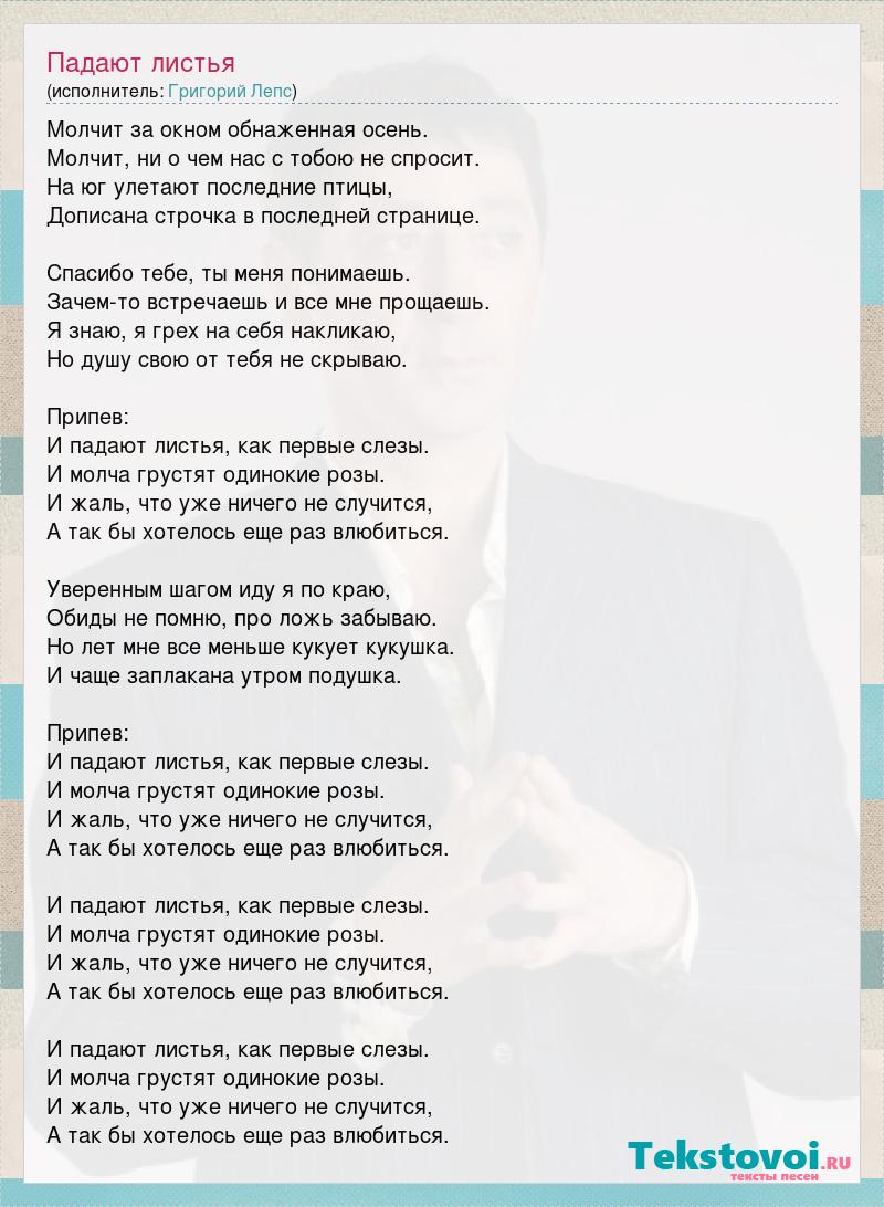 Молчит за окном обнаженная осень. Молчит, ни о чем нас с тобою не спросит. На юг улетают последние птицы, Дописана строчка в последней странице. Спасибо тебе, ты меня понимаешь. Зачем-то встречаешь и все мне прощаешь. Я знаю, я грех на себя накликаю, Но душу свою от тебя не скрываю. Припев: И падают листья, как первые слезы. И молча грустят одинокие розы. И жаль, что уже ничего не случится, А так бы хотелось еще раз влюбиться. Уверенным шагом иду я по краю, Обиды не помню, про ложь забываю. Но лет мне все меньше кукует кукушка. И чаще заплакана утром подушка. Припев: И падают листья, как первые слезы. И молча грустят одинокие розы. И жаль, что уже ничего не случится, А так бы хотелось еще раз влюбиться. И падают листья, как первые слезы. И молча грустят одинокие розы. И жаль, что уже ничего не случится, А так бы хотелось еще раз влюбиться. И падают листья, как первые слезы. И молча грустят одинокие розы. И жаль, что уже ничего не случится, А так бы хотелось еще раз влюбиться.