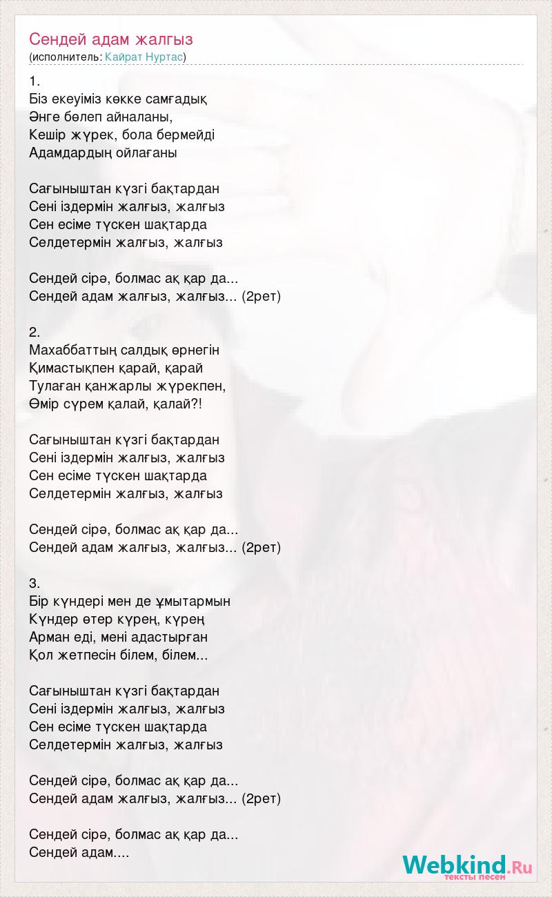 1. Біз екеуіміз көкке самғадық Әнге бөлеп айналаны, Кешір жүрек, бола бермейді Адамдардың ойлағаны Сағыныштан күзгі бақтардан Сені іздермін жалғыз, жалғыз Сен есіме түскен шақтарда Селдетермін жалғыз, жалғыз Сендей сірә, болмас ақ қар да... Сендей адам жалғыз, жалғыз... (2рет) 2. Махаббаттың салдық өрнегін Қимастықпен қарай, қарай Тулаған қанжарлы жүрекпен, Өмір сүрем қалай, қалай?! Сағыныштан күзгі бақтардан Сені іздермін жалғыз, жалғыз Сен есіме түскен шақтарда Селдетермін жалғыз, жалғыз Сендей сірә, болмас ақ қар да... Сендей адам жалғыз, жалғыз... (2рет) 3. Бір күндері мен де ұмытармын Күндер өтер күрең, күрең Арман еді, мені адастырған Қол жетпесін білем, білем... Сағыныштан күзгі бақтардан Сені іздермін жалғыз, жалғыз Сен есіме түскен шақтарда Селдетермін жалғыз, жалғыз Сендей сірә, болмас ақ қар да... Сендей адам жалғыз, жалғыз... (2рет) Сендей сірә, болмас ақ қар да... Сендей адам....