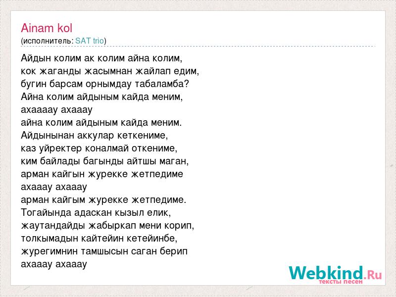 Айдын колим ак колим айна колим, кок жаганды жасымнан жайлап едим, бугин барсам орнымдау табаламба? Айна колим айдыным кайда меним, ахаааау ахааау айна колим айдыным кайда меним. Айдынынан аккулар кеткениме, каз уйректер коналмай откениме, ким байлады багынды айтшы маган, арман кайгын журекке жетпедиме ахааау ахааау арман кайгым журекке жетпедиме. Тогайында адаскан кызыл елик, жаутандайды жабыркап мени корип, толкымадын кайтейин кетейинбе, журегимнин тамшысын саган берип ахааау ахааау