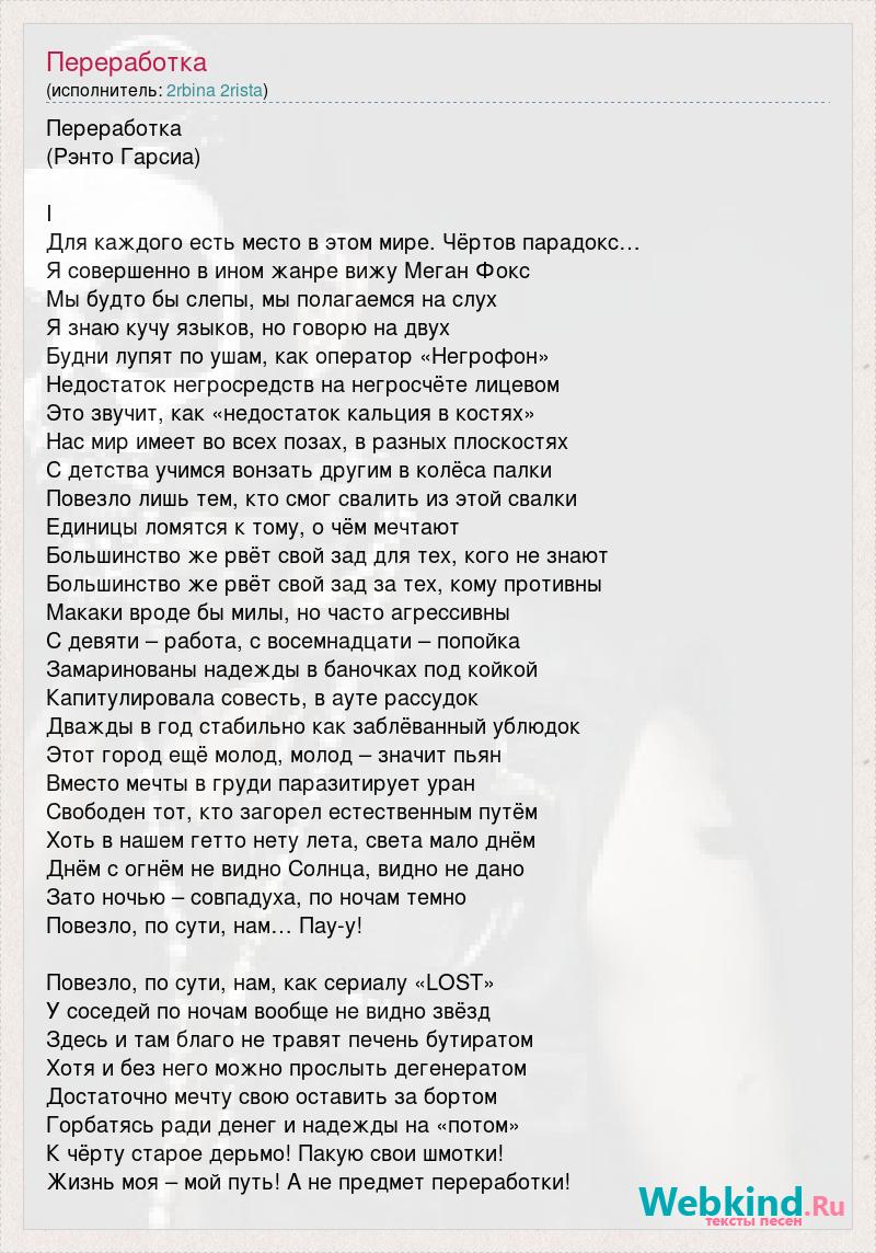 Переработка (Рэнто Гарсиа) I Для каждого есть место в этом мире. Чёртов парадокс… Я совершенно в ином жанре вижу Меган Фокс Мы будто бы слепы, мы полагаемся на слух Я знаю кучу языков, но говорю на двух Будни лупят по ушам, как оператор «Негрофон» Недостаток негросредств на негросчёте лицевом Это звучит, как «недостаток кальция в костях» Нас мир имеет во всех позах, в разных плоскостях С детства учимся вонзать другим в колёса палки Повезло лишь тем, кто смог свалить из этой свалки Единицы ломятся к тому, о чём мечтают Большинство же рвёт свой зад для тех, кого не знают Большинство же рвёт свой зад за тех, кому противны Макаки вроде бы милы, но часто агрессивны С девяти – работа, с восемнадцати – попойка Замаринованы надежды в баночках под койкой Капитулировала совесть, в ауте рассудок Дважды в год стабильно как заблёванный ублюдок Этот город ещё молод, молод – значит пьян Вместо мечты в груди паразитирует уран Свободен тот, кто загорел естественным путём Хоть в нашем гетто нету лета, света мало днём Днём с огнём не видно Солнца, видно не дано Зато ночью – совпадуха, по ночам темно Повезло, по сути, нам… Пау-у! Повезло, по сути, нам, как сериалу «LOST» У соседей по ночам вообще не видно звёзд Здесь и там благо не травят печень бутиратом Хотя и без него можно прослыть дегенератом Достаточно мечту свою оставить за бортом Горбатясь ради денег и надежды на «потом» К чёрту старое дерьмо! Пакую свои шмотки! Жизнь моя – мой путь! А не предмет переработки!