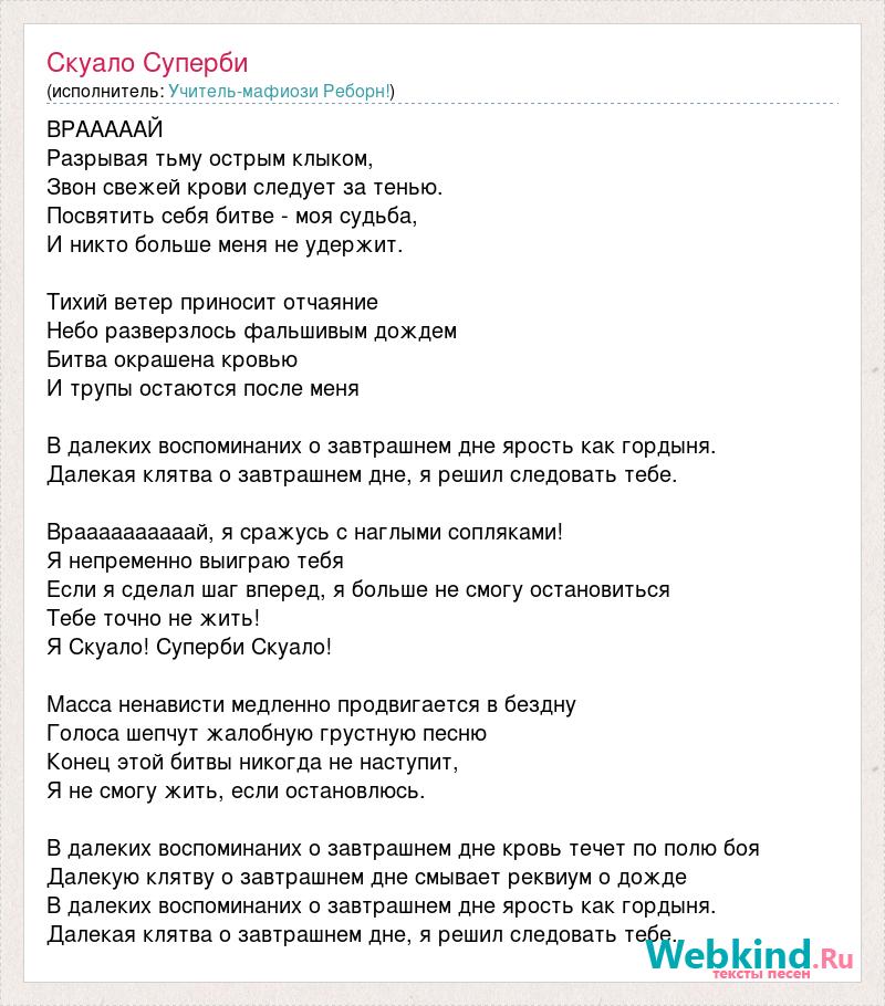 ВРАААААЙ Разрывая тьму острым клыком, Звон свежей крови следует за тенью. Посвятить себя битве - моя судьба, И никто больше меня не удержит. Тихий ветер приносит отчаяние Небо разверзлось фальшивым дождем Битва окрашена кровью И трупы остаются после меня В далеких воспоминаних о завтрашнем дне ярость как гордыня. Далекая клятва о завтрашнем дне, я решил следовать тебе. Враааааааааай, я сражусь с наглыми сопляками! Я непременно выиграю тебя Если я сделал шаг вперед, я больше не смогу остановиться Тебе точно не жить! Я Скуало! Суперби Скуало! Масса ненависти медленно продвигается в бездну Голоса шепчут жалобную грустную песню Конец этой битвы никогда не наступит, Я не смогу жить, если остановлюсь. В далеких воспоминаних о завтрашнем дне кровь течет по полю боя Далекую клятву о завтрашнем дне смывает реквиум о дожде В далеких воспоминаних о завтрашнем дне ярость как гордыня. Далекая клятва о завтрашнем дне, я решил следовать тебе.