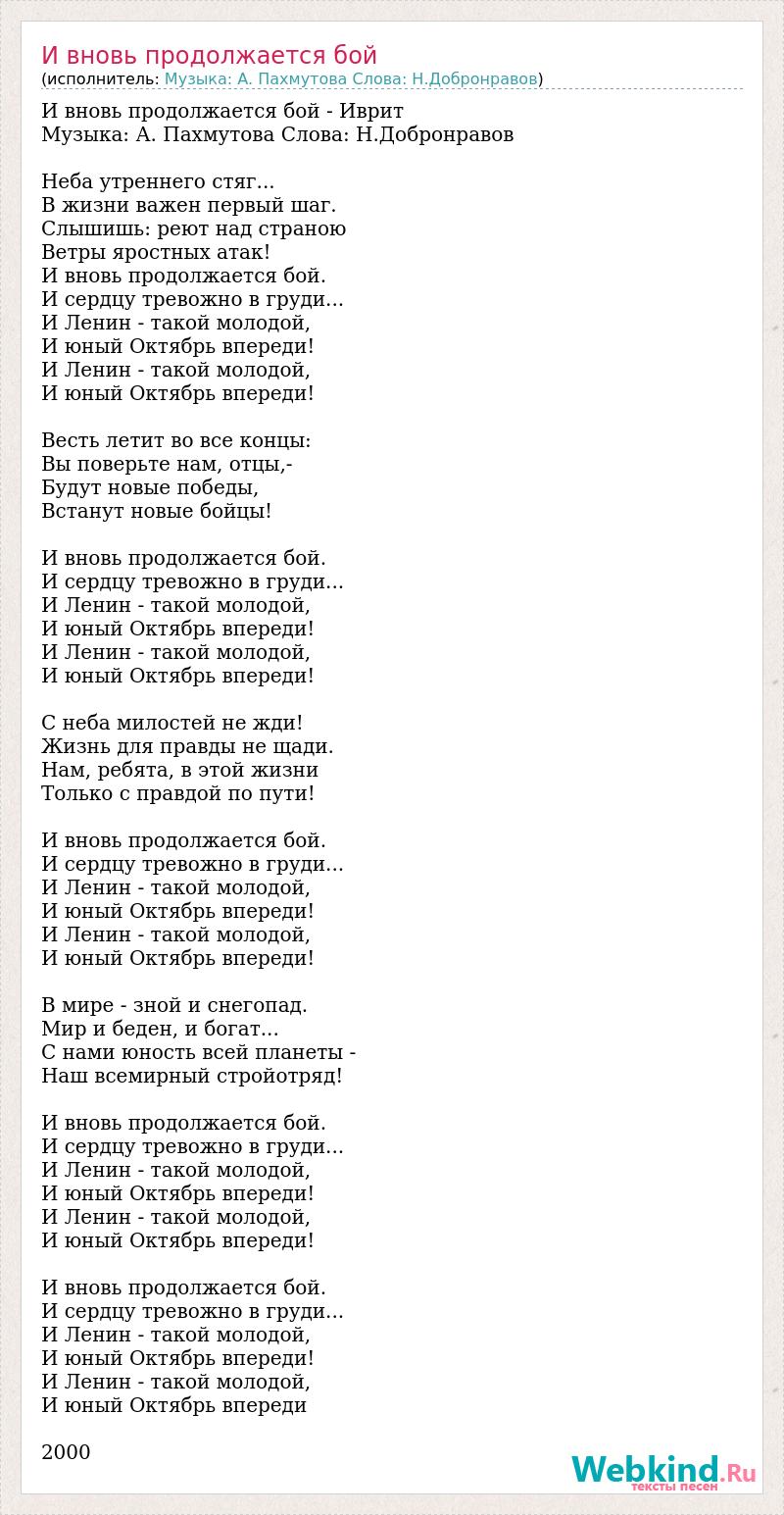 И вновь продолжается бой - Иврит Музыка: А. Пахмутова Слова: Н.Добронравов Неба утреннего стяг... В жизни важен первый шаг. Слышишь: реют над страною Ветры яростных атак! И вновь продолжается бой. И сердцу тревожно в груди... И Ленин - такой молодой, И юный Октябрь впереди! И Ленин - такой молодой, И юный Октябрь впереди! Весть летит во все концы: Вы поверьте нам, отцы,- Будут новые победы, Встанут новые бойцы! И вновь продолжается бой. И сердцу тревожно в груди... И Ленин - такой молодой, И юный Октябрь впереди! И Ленин - такой молодой, И юный Октябрь впереди! С неба милостей не жди! Жизнь для правды не щади. Нам, ребята, в этой жизни Только с правдой по пути! И вновь продолжается бой. И сердцу тревожно в груди... И Ленин - такой молодой, И юный Октябрь впереди! И Ленин - такой молодой, И юный Октябрь впереди! В мире - зной и снегопад. Мир и беден, и богат... С нами юность всей планеты - Наш всемирный стройотряд! И вновь продолжается бой. И сердцу тревожно в груди... И Ленин - такой молодой, И юный Октябрь впереди! И Ленин - такой молодой, И юный Октябрь впереди! И вновь продолжается бой. И сердцу тревожно в груди... И Ленин - такой молодой, И юный Октябрь впереди! И Ленин - такой молодой, И юный Октябрь впереди 2000