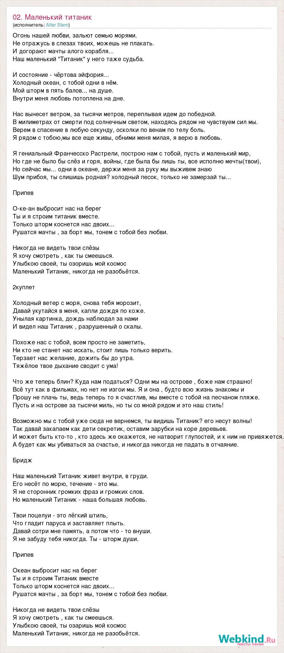 Огонь нашей любви, зальют семью морями. Не отражусь в слезах твоих, можешь не плакать. И догорают мачты алого корабля... Наш маленький "Титаник" у него таже судьба. И состояние - чёртова эйфория... Холодный океан, с тобой одни в нём. Мой шторм в пять балов... на душе. Внутри меня любовь потоплена на дне. Нас вынесет ветром, за тысячи метров, переплывая идем до победной. В милиметрах от смерти под солнечным светом, находясь рядом не чувствуем сил мы. Верем в спасение в любую секунду, осколки по венам по телу боль. Я рядом с тобою,мы все еще живы, обними меня милая, я верю в любовь. Я гениальный Франчесско Растрели, построю нам с тобой, пусть и маленький мир, Но где не было бы слёз и горя, войны, где была бы лишь ты, все исполню мечты(твои), Но сейчас мы... одни в океане, держи меня за руку мы выживем знаю Шум прибоя, ты слишишь родная? холодный песок, только не замерзай ты... Припев О-ке-ан выбросит нас на берег Ты и я строим титаник вместе. Только шторм коснется нас двоих... Рушатся мачты , за борт мы, тонем с тобой без любви. Никогда не видеть твои слёзы Я хочу смотреть , как ты смеешься. Улыбкою своей, ты озоришь мой космос Маленький Титаник, никогда не разобьётся. 2куплет Холодный ветер с моря, снова тебя морозит, Давай укутайся в меня, капли дождя по коже. Унылая картинка, дождь наблюдал за нами И видел наш Титаник , разрушенный о скалы. Похоже нас с тобой, всем просто не заметить, Ни кто не станет нас искать, стоит лишь только верить. Терзает нас желание, дожить бы до утра. Тяжёлое твое дыхание сводит с ума! Что же теперь блин? Куда нам податься? Одни мы на острове , боже нам страшно! Всё тут как в фильмах, но нет не изгои мы. Я и она , будто всю жизнь знакомы и Прошу не плачь ты, ведь теперь то я счастлив, мы вместе с тобой на песчаном пляже. Пусть и на острове за тысячи миль, но ты со мной рядом и это наш стиль! Возможно мы с тобой уже сюда не вернемся, ты видишь Титаник? его несут волны! Так давай закапаем как дети секретик, оставим зарубки на коре деревьев. И может быть кто-то , кто здесь же окажется, не натворит глупостей, и к ним не привяжется. А будет как мы убиваться за счастье, и никогда никогда не падать в отчаяние. Бридж Наш маленький Титаник живет внутри, в груди. Его несёт по морю, течение - это мы. Я не сторонник громких фраз и громких слов. Но маленький Титаник - наша большая любовь. Твои поцелуи - это лёгкий штиль, Что гладит паруса и заставляет плыть. Давай сотри мне память, а потом что - то внуши. Я не забуду тебя никогда. Ты - шторм души. Припев Океан выбросит нас на берег Ты и я строим Титаник вместе Только шторм коснется нас двоих... Рушатся мачты , за борт мы, тонем с тобой без любви. Никогда не видеть твои слёзы Я хочу смотреть , как ты смеешься. Улыбкою своей, ты озаришь мой космос Маленький Титаник, никогда не разобьётся.