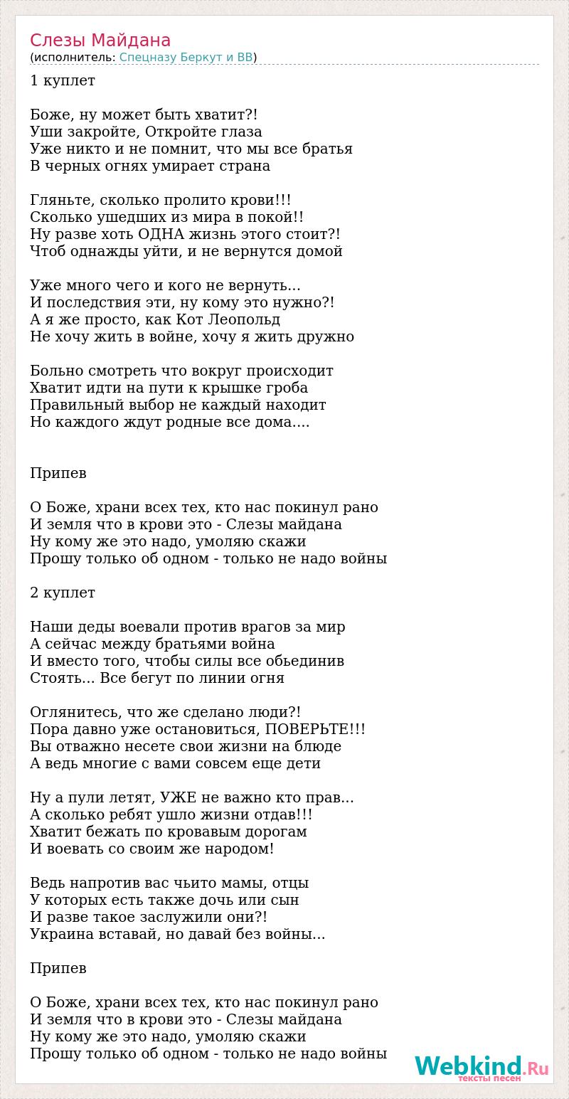 1 куплет Боже, ну может быть хватит?! Уши закройте, Откройте глаза Уже никто и не помнит, что мы все братья В черных огнях умирает страна Гляньте, сколько пролито крови!!! Сколько ушедших из мира в покой!! Ну разве хоть ОДНА жизнь этого стоит?! Чтоб однажды уйти, и не вернутся домой Уже много чего и кого не вернуть... И последствия эти, ну кому это нужно?! А я же просто, как Кот Леопольд Не хочу жить в войне, хочу я жить дружно Больно смотреть что вокруг происходит Хватит идти на пути к крышке гроба Правильный выбор не каждый находит Но каждого ждут родные все дома.... Припев О Боже, храни всех тех, кто нас покинул рано И земля что в крови это - Слезы майдана Ну кому же это надо, умоляю скажи Прошу только об одном - только не надо войны 2 куплет Наши деды воевали против врагов за мир А сейчас между братьями война И вместо того, чтобы силы все обьединив Стоять... Все бегут по линии огня Оглянитесь, что же сделано люди?! Пора давно уже остановиться, ПОВЕРЬТЕ!!! Вы отважно несете свои жизни на блюде А ведь многие с вами совсем еще дети Ну а пули летят, УЖЕ не важно кто прав... А сколько ребят ушло жизни отдав!!! Хватит бежать по кровавым дорогам И воевать со своим же народом! Ведь напротив вас чьито мамы, отцы У которых есть также дочь или сын И разве такое заслужили они?! Украина вставай, но давай без войны... Припев О Боже, храни всех тех, кто нас покинул рано И земля что в крови это - Слезы майдана Ну кому же это надо, умоляю скажи Прошу только об одном - только не надо войны