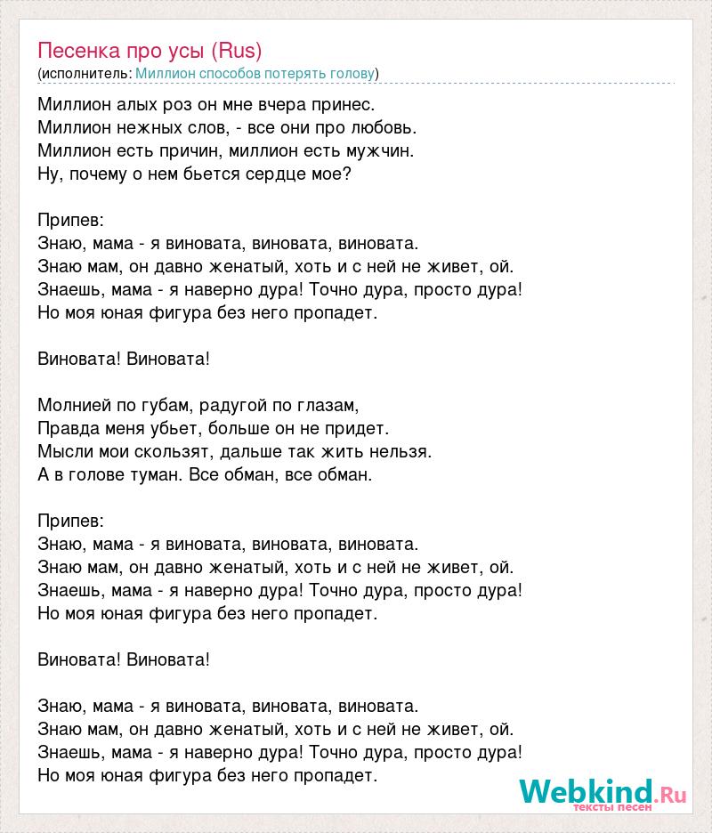 Миллион алых роз он мне вчера принес. Миллион нежных слов, - все они про любовь. Миллион есть причин, миллион есть мужчин. Ну, почему о нем бьется сердце мое? Припев: Знаю, мама - я виновата, виновата, виновата. Знаю мам, он давно женатый, хоть и с ней не живет, ой. Знаешь, мама - я наверно дура! Точно дура, просто дура! Но моя юная фигура без него пропадет. Виновата! Виновата! Молнией по губам, радугой по глазам, Правда меня убьет, больше он не придет. Мысли мои скользят, дальше так жить нельзя. А в голове туман. Все обман, все обман. Припев: Знаю, мама - я виновата, виновата, виновата. Знаю мам, он давно женатый, хоть и с ней не живет, ой. Знаешь, мама - я наверно дура! Точно дура, просто дура! Но моя юная фигура без него пропадет. Виновата! Виновата! Знаю, мама - я виновата, виновата, виновата. Знаю мам, он давно женатый, хоть и с ней не живет, ой. Знаешь, мама - я наверно дура! Точно дура, просто дура! Но моя юная фигура без него пропадет.