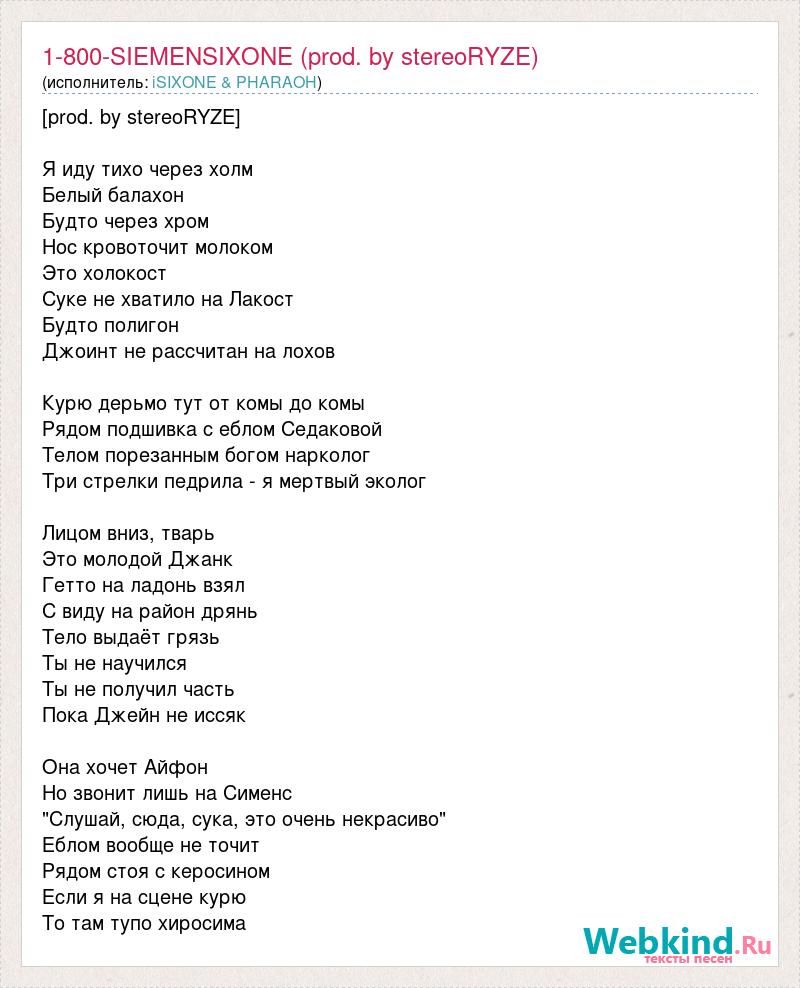[prod. by stereoRYZE] Я иду тихо через холм Белый балахон Будто через хром Нос кровоточит молоком Это холокост Суке не хватило на Лакост Будто полигон Джоинт не рассчитан на лохов Курю дерьмо тут от комы до комы Рядом подшивка с еблом Седаковой Телом порезанным богом нарколог Три стрелки педрила - я мертвый эколог Лицом вниз, тварь Это молодой Джанк Гетто на ладонь взял С виду на район дрянь Тело выдаёт грязь Ты не научился Ты не получил часть Пока Джейн не иссяк Она хочет Айфон Но звонит лишь на Сименс "Слушай, сюда, сука, это очень некрасиво" Еблом вообще не точит Рядом стоя с керосином Если я на сцене курю То там тупо хиросима