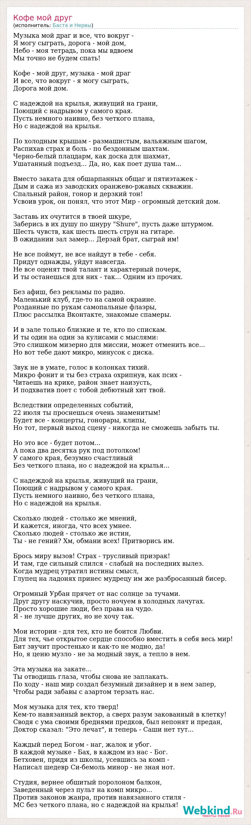 Музыка мой драг и все, что вокруг - Я могу сыграть, дорога - мой дом, Небо - моя тетрадь, пока мы вдвоем Мы точно не будем спать! Кофе - мой друг, музыка - мой драг И все, что вокруг - я могу сыграть, Дорога мой дом. С надеждой на крылья, живущий на грани, Поющий с надрывом у самого края. Пусть немного наивно, без четкого плана, Но с надеждой на крылья. По холодным крышам - размашистым, вальяжным шагом, Распихав страх и боль - по бездонным шахтам. Черно-белый плацдарм, как доска для шахмат, Ушатанный подъезд... Да, но, как поет душа там... Вместо заката для обшарпанных общаг и пятиэтажек - Дым и сажа из заводских оранжево-ржавых скважин. Спальный район, гонор и дерзкий тон! Усвоив урок, он понял, что этот Мир - огромный детский дом. Заставь их очутится в твоей шкуре, Заберись в их душу по шнуру "Shure", пусть даже штурмом. Шесть чувств, как шесть шесть струн на гитаре. В ожидании зал замер... Дерзай брат, сыграй им! Не все поймут, не все найдут в тебе - себя. Придут однажды, уйдут навсегда. Не все оценят твой талант и характерный почерк, И ты останешься для них - так... Одним из прочих. Без афиш, без рекламы по радио. Маленький клуб, где-то на самой окраине. Розданные по рукам самопальные флаэры, Плюс рассылка Вконтакте, знакомые спамеры. И в зале только близкие и те, кто по спискам. И ты один на один за кулисами с мыслями: Это слишком мизерно для миссии, может отменить все... Но вот тебе дают микро, минусок с диска. Звук не в умате, голос в колонках тихий. Микро фонит и ты без страха охрипнув, как псих - Читаешь на крике, район знает наизусть, И подхватив поет с тобой дебютный хит твой. Вследствии определенных событий, 22 июля ты проснешься очень знаменитым! Будет все - концерты, гонорары, клипы, Но тот, первый выход сцену - никогда не сможешь забыть ты. Но это все - будет потом... А пока два десятка рук под потолком! У самого края, безумно счастливый Без четкого плана, но с надеждой на крылья... С надеждой на крылья, живущий на грани, Поющий с надрывом у самого края. Пусть немного наивно, без четкого плана, Но с надеждой на крылья. Сколько людей - столько же мнений, И кажется, иногда, что всех умнее. Сколько людей - столько же истин, Ты - не гений? Хм, обмани всех! Притворись им. Брось миру вызов! Страх - трусливый призрак! И там, где сильный слился - слабый на последних вылез. Когда мудрец утратил истины смысл, Глупец на ладонях принес мудрецу им же разбросанный бисер. Огромный Урбан прячет от нас солнце за тучами. Друг другу наскучив, просто ночуем в холодных лачугах. Просто хорошие люди, без права на чудо. Я - не лучше других, но не хочу так. Мои истории - для тех, кто не боится Любви. Для тех, чье открытое сердце способно вместить в себя весь мир! Бит звучит простенько и как-то не модно, да! Но, я ценю музло - не за модный звук, а тепло в нем. Эта музыка на закате... Ты отводишь глаза, чтобы снова не заплакать. По ходу - наш мир создал безумный дизайнер и в нем запер, Чтобы ради забавы с азартом терзать нас. Моя музыка для тех, кто тверд! Кем-то навязанный вектор, а сверх разум закованный в клетку! Сводя с ума своими бреднями предков, был непонят и предан, Доктор сказал: "Это лечат", и теперь - Саши нет тут... Каждый перед Богом - наг, жалок и убог. В каждой музыке - Бах, в каждом из нас - Бог. Бетховен, придя из школы, усевшись за комп - Написал шедевр Си-бемоль минор - не зная нот. Студия, вернее обшитый поролоном балкон, Заведен