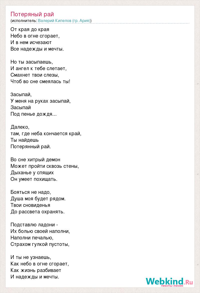От края до края Небо в огне сгорает, И в нем исчезают Все надежды и мечты. Но ты засыпаешь, И ангел к тебе слетает, Смахнет твои слезы, Чтоб во сне смеялась ты! 3асыпай, У меня на руках засыпай, Засыпай Под пенье дождя... Далеко, там, где неба кончается край, Ты найдешь Потерянный рай. Во сне хитрый демон Может пройти сквозь стены, Дыханье у спящих Он умеет похищать. Бояться не надо, Душа моя будет рядом. Твои сновиденья До рассвета охранять. Подставлю ладони - Их болью своей наполни, Наполни печалью, Страхом гулкой пустоты, И ты не узнаешь, Как небо в огне сгорает, Как жизнь разбивает И надежды и мечты.