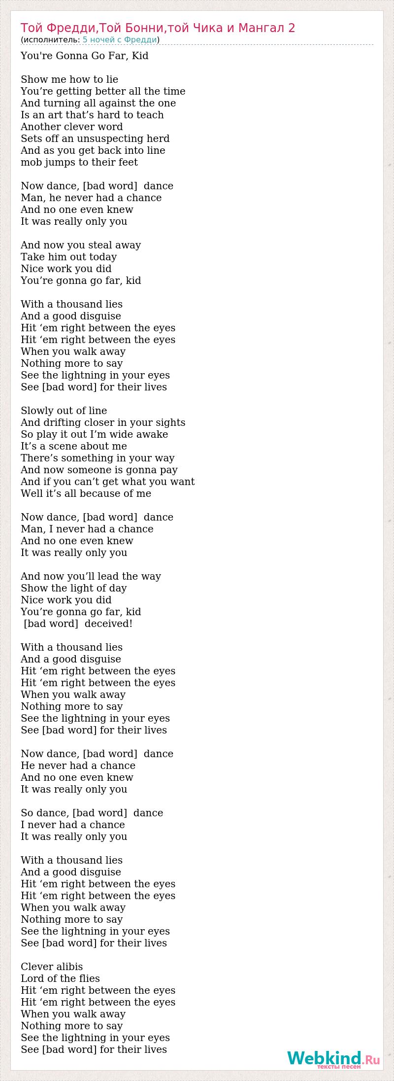 You're Gonna Go Far, Kid Show me how to lie You’re getting better all the time And turning all against the one Is an art that’s hard to teach Another clever word Sets off an unsuspecting herd And as you get back into line mob jumps to their feet Now dance, [bad word] dance Man, he never had a chance And no one even knew It was really only you And now you steal away Take him out today Nice work you did You’re gonna go far, kid With a thousand lies And a good disguise Hit ‘em right between the eyes Hit ‘em right between the eyes When you walk away Nothing more to say See the lightning in your eyes See [bad word] for their lives Slowly out of line And drifting closer in your sights So play it out I’m wide awake It’s a scene about me There’s something in your way And now someone is gonna pay And if you can’t get what you want Well it’s all because of me Now dance, [bad word] dance Man, I never had a chance And no one even knew It was really only you And now you’ll lead the way Show the light of day Nice work you did You’re gonna go far, kid [bad word] deceived! With a thousand lies And a good disguise Hit ‘em right between the eyes Hit ‘em right between the eyes When you walk away Nothing more to say See the lightning in your eyes See [bad word] for their lives Now dance, [bad word] dance He never had a chance And no one even knew It was really only you So dance, [bad word] dance I never had a chance It was really only you With a thousand lies And a good disguise Hit ‘em right between the eyes Hit ‘em right between the eyes When you walk away Nothing more to say See the lightning in your eyes See [bad word] for their lives Clever alibis Lord of the flies Hit ‘em right between the eyes Hit ‘em right between the eyes When you walk away Nothing more to say See the lightning in your eyes See [bad word] for their lives