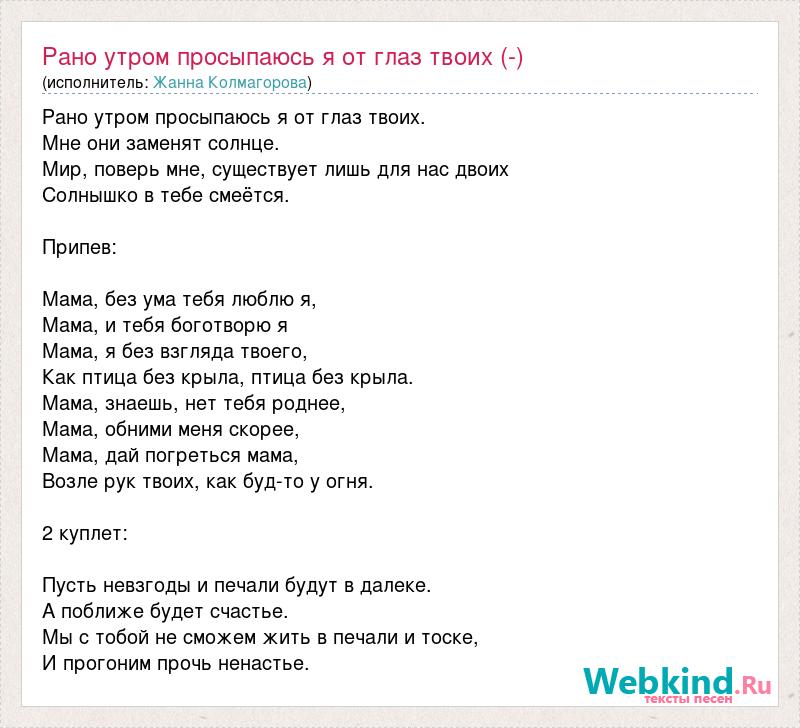Рано утром просыпаюсь я от глаз твоих. Мне они заменят солнце. Мир, поверь мне, существует лишь для нас двоих Солнышко в тебе смеётся. Припев: Мама, без ума тебя люблю я, Мама, и тебя боготворю я Мама, я без взгляда твоего, Как птица без крыла, птица без крыла. Мама, знаешь, нет тебя роднее, Мама, обними меня скорее, Мама, дай погреться мама, Возле рук твоих, как буд-то у огня. 2 куплет: Пусть невзгоды и печали будут в далеке. А поближе будет счастье. Мы с тобой не сможем жить в печали и тоске, И прогоним прочь ненастье.