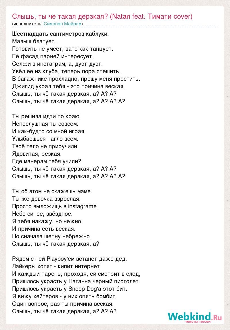 Шестнадцать сантиметров каблуки. Малыш блатует. Готовить не умеет, зато как танцует. Её фасад парней интересует. Селфи в инстаграм, а, дуэт-дуэт. Увёл ее из клуба, теперь пора спешить. В багажнике прохладно, прошу меня простить. Джигид украл тебя - это причина веская. Слышь, ты чё такая дерзкая, а? А? А? Слышь, ты чё такая дерзкая, а? А? А? А? Ты решила идти по краю. Непослушная ты совсем. И как-будто со мной играя. Улыбаешься нагло всем. Твоё тело не приручили. Ядовитая, резкая. Где манерам тебя учили? Слышь, ты чё такая дерзкая, а? А? А? Слышь, ты чё такая дерзкая, а? А? А? А? Ты об этом не скажешь маме. Ты же девочка взрослая. Просто выложищь в instagramе. Небо синее, звёздное. Я тебя накажу, но нежно. И причина есть веская. Но сначала шепну небрежно. Слышь, ты чё такая дерзкая, а? Рядом с ней Plаyboy'ем встанет даже дед. Лайкеры хотят - кипит интернет. И каждый парень, проходя, ей смотрит в след, Пришлось украсть у Наганна черный пистолет. Пришлось украсть у Snoop Dog'а этот бит. Я вижу хейтеров - у них опять бомбит. Один вопрос, раз ты причина веская. Слышь, ты чё такая дерзкая, а? А? А?