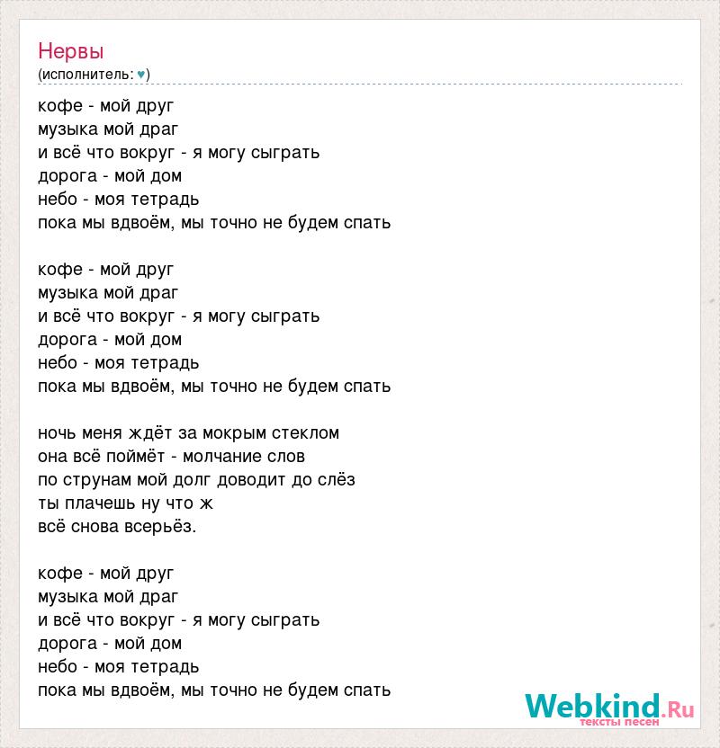кофе - мой друг музыка мой драг и всё что вокруг - я могу сыграть дорога - мой дом небо - моя тетрадь пока мы вдвоём, мы точно не будем спать кофе - мой друг музыка мой драг и всё что вокруг - я могу сыграть дорога - мой дом небо - моя тетрадь пока мы вдвоём, мы точно не будем спать ночь меня ждёт за мокрым стеклом она всё поймёт - молчание слов по струнам мой долг доводит до слёз ты плачешь ну что ж всё снова всерьёз. кофе - мой друг музыка мой драг и всё что вокруг - я могу сыграть дорога - мой дом небо - моя тетрадь пока мы вдвоём, мы точно не будем спать