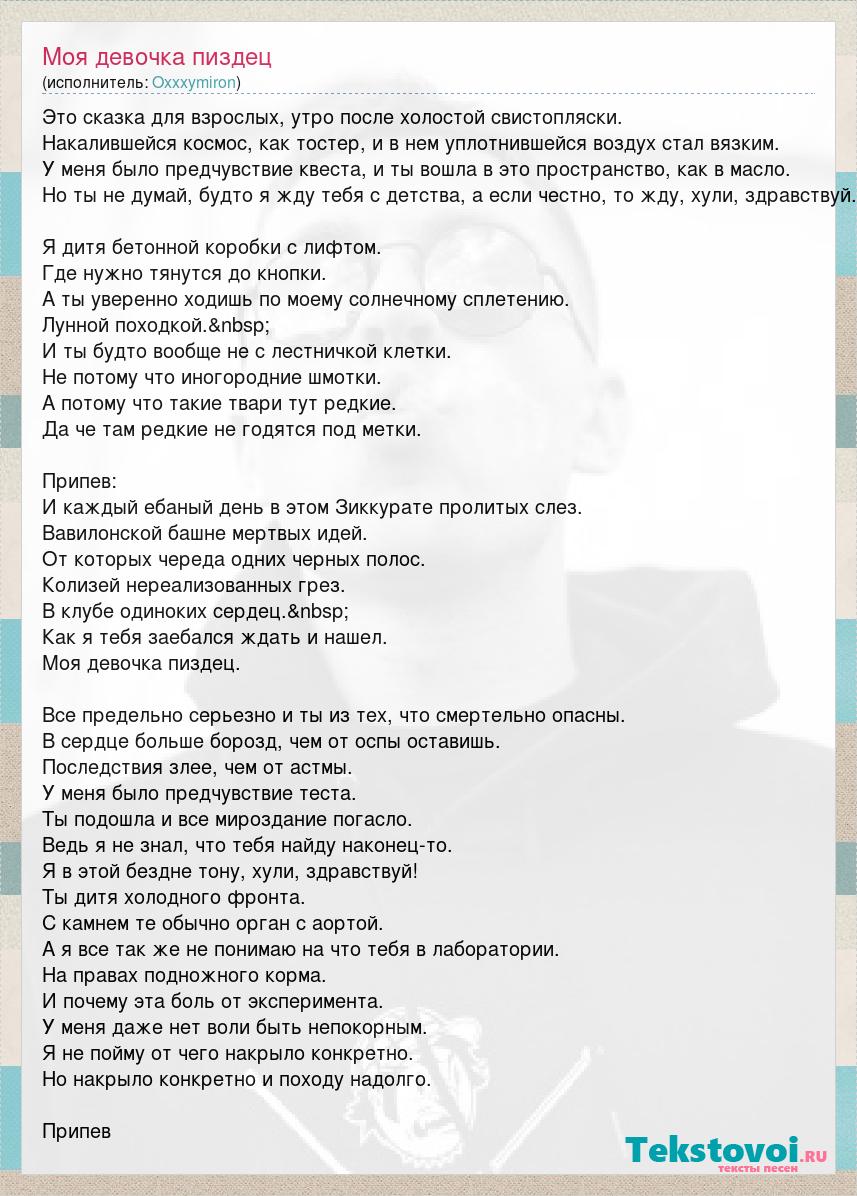 Это сказка для взрослых, утро после холостой свистопляски. Накалившейся космос, как тостер, и в нем уплотнившейся воздух стал вязким. У меня было предчувствие квеста, и ты вошла в это пространство, как в масло. Но ты не думай, будто я жду тебя с детства, а если честно, то жду, хули, здравствуй. Я дитя бетонной коробки с лифтом. Где нужно тянутся до кнопки. А ты уверенно ходишь по моему солнечному сплетению. Лунной походкой. И ты будто вообще не с лестничкой клетки. Не потому что иногородние шмотки. А потому что такие твари тут редкие. Да че там редкие не годятся под метки. Припев: И каждый ебаный день в этом Зиккурате пролитых слез. Вавилонской башне мертвых идей. От которых череда одних черных полос. Колизей нереализованных грез. В клубе одиноких сердец. Как я тебя заебался ждать и нашел. Моя девочка пиздец. Все предельно серьезно и ты из тех, что смертельно опасны. В сердце больше борозд, чем от оспы оставишь. Последствия злее, чем от астмы. У меня было предчувствие теста. Ты подошла и все мироздание погасло. Ведь я не знал, что тебя найду наконец-то. Я в этой бездне тону, хули, здравствуй! Ты дитя холодного фронта. С камнем те обычно орган с аортой. А я все так же не понимаю на что тебя в лаборатории. На правах подножного корма. И почему эта боль от эксперимента. У меня даже нет воли быть непокорным. Я не пойму от чего накрыло конкретно. Но накрыло конкретно и походу надолго. Припев