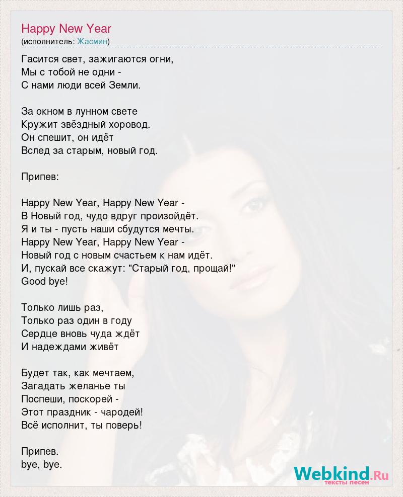 Гасится свет, зажигаются огни, Мы с тобой не одни - С нами люди всей Земли. За окном в лунном свете Кружит звёздный хоровод. Он спешит, он идёт Вслед за старым, новый год. Припев: Happy New Year, Happy New Year - В Новый год, чудо вдруг произойдёт. Я и ты - пусть наши сбудутся мечты. Happy New Year, Happy New Year - Новый год с новым счастьем к нам идёт. И, пускай все скажут: "Старый год, прощай!" Good bye! Только лишь раз, Только раз один в году Сердце вновь чуда ждёт И надеждами живёт Будет так, как мечтаем, Загадать желанье ты Поспеши, поскорей - Этот праздник - чародей! Всё исполнит, ты поверь! Припев. bye, bye.