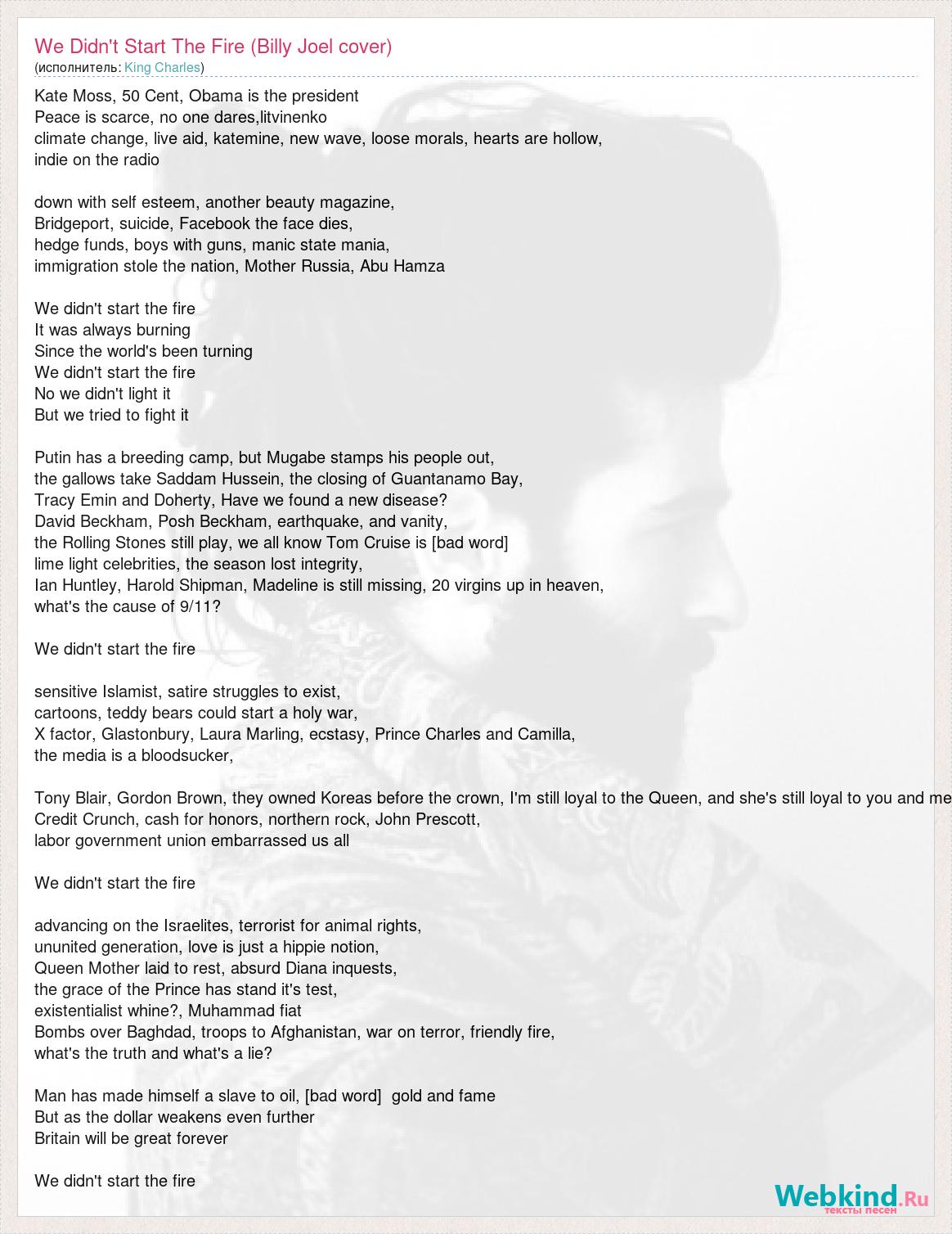 Kate Moss, 50 Cent, Obama is the president Peace is scarce, no one dares,litvinenko climate change, live aid, katemine, new wave, loose morals, hearts are hollow, indie on the radio down with self esteem, another beauty magazine, Bridgeport, suicide, Facebook the face dies, hedge funds, boys with guns, manic state mania, immigration stole the nation, Mother Russia, Abu Hamza We didn't start the fire It was always burning Since the world's been turning We didn't start the fire No we didn't light it But we tried to fight it Putin has a breeding camp, but Mugabe stamps his people out, the gallows take Saddam Hussein, the closing of Guantanamo Bay, Tracy Emin and Doherty, Have we found a new disease? David Beckham, Posh Beckham, earthquake, and vanity, the Rolling Stones still play, we all know Tom Cruise is [bad word] lime light celebrities, the season lost integrity, Ian Huntley, Harold Shipman, Madeline is still missing, 20 virgins up in heaven, what's the cause of 9/11? We didn't start the fire sensitive Islamist, satire struggles to exist, cartoons, teddy bears could start a holy war, X factor, Glastonbury, Laura Marling, ecstasy, Prince Charles and Camilla, the media is a bloodsucker, Tony Blair, Gordon Brown, they owned Koreas before the crown, I'm still loyal to the Queen, and she's still loyal to you and me Credit Crunch, cash for honors, northern rock, John Prescott, labor government union embarrassed us all We didn't start the fire advancing on the Israelites, terrorist for animal rights, ununited generation, love is just a hippie notion, Queen Mother laid to rest, absurd Diana inquests, the grace of the Prince has stand it's test, existentialist whine?, Muhammad fiat Bombs over Baghdad, troops to Afghanistan, war on terror, friendly fire, what's the truth and what's a lie? Man has made himself a slave to oil, [bad word] gold and fame But as the dollar weakens even further Britain will be great forever We didn't start the fire