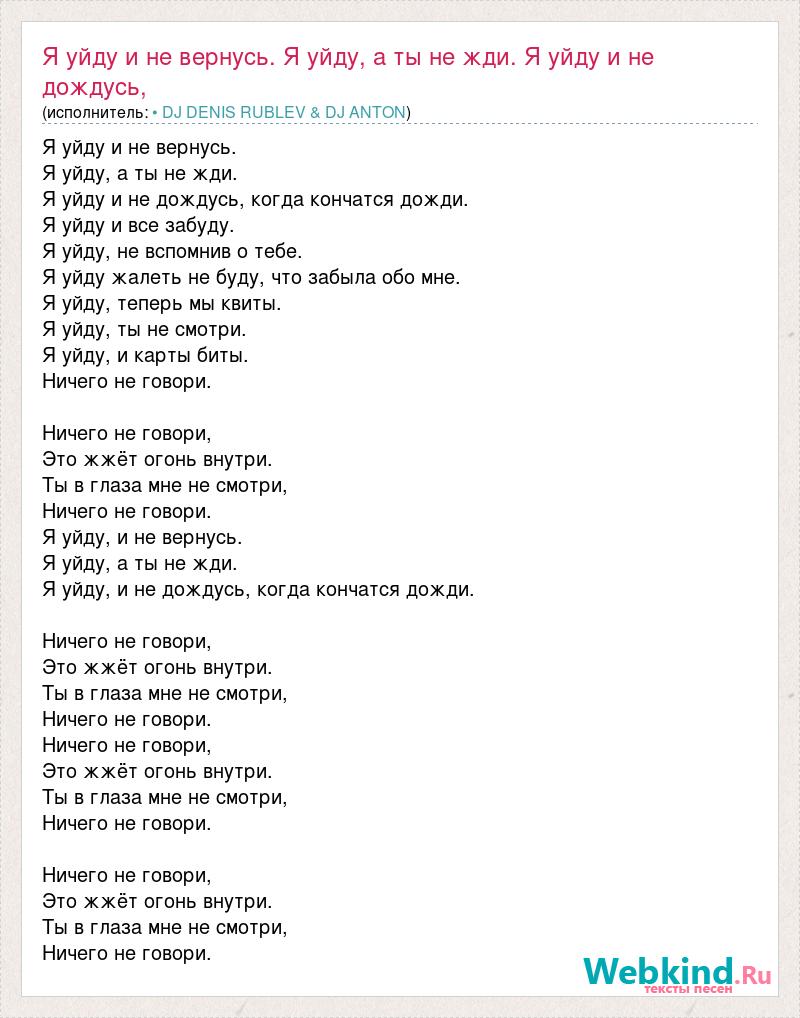 Я уйду и не вернусь. Я уйду, а ты не жди. Я уйду и не дождусь, когда кончатся дожди. Я уйду и все забуду. Я уйду, не вспомнив о тебе. Я уйду жалеть не буду, что забыла обо мне. Я уйду, теперь мы квиты. Я уйду, ты не смотри. Я уйду, и карты биты. Ничего не говори. Ничего не говори, Это жжёт огонь внутри. Ты в глаза мне не смотри, Ничего не говори. Я уйду, и не вернусь. Я уйду, а ты не жди. Я уйду, и не дождусь, когда кончатся дожди. Ничего не говори, Это жжёт огонь внутри. Ты в глаза мне не смотри, Ничего не говори. Ничего не говори, Это жжёт огонь внутри. Ты в глаза мне не смотри, Ничего не говори. Ничего не говори, Это жжёт огонь внутри. Ты в глаза мне не смотри, Ничего не говори.