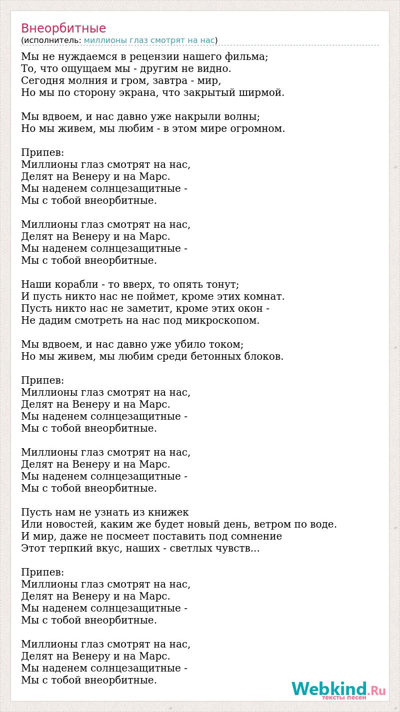 Мы не нуждаемся в рецензии нашего фильма; То, что ощущаем мы - другим не видно. Сегодня молния и гром, завтра - мир, Но мы по сторону экрана, что закрытый ширмой. Мы вдвоем, и нас давно уже накрыли волны; Но мы живем, мы любим - в этом мире огромном. Припев: Миллионы глаз смотрят на нас, Делят на Венеру и на Марс. Мы наденем солнцезащитные - Мы с тобой внеорбитные. Миллионы глаз смотрят на нас, Делят на Венеру и на Марс. Мы наденем солнцезащитные - Мы с тобой внеорбитные. Наши корабли - то вверх, то опять тонут; И пусть никто нас не поймет, кроме этих комнат. Пусть никто нас не заметит, кроме этих окон - Не дадим смотреть на нас под микроскопом. Мы вдвоем, и нас давно уже убило током; Но мы живем, мы любим среди бетонных блоков. Припев: Миллионы глаз смотрят на нас, Делят на Венеру и на Марс. Мы наденем солнцезащитные - Мы с тобой внеорбитные. Миллионы глаз смотрят на нас, Делят на Венеру и на Марс. Мы наденем солнцезащитные - Мы с тобой внеорбитные. Пусть нам не узнать из книжек Или новостей, каким же будет новый день, ветром по воде. И мир, даже не посмеет поставить под сомнение Этот терпкий вкус, наших - светлых чувств... Припев: Миллионы глаз смотрят на нас, Делят на Венеру и на Марс. Мы наденем солнцезащитные - Мы с тобой внеорбитные. Миллионы глаз смотрят на нас, Делят на Венеру и на Марс. Мы наденем солнцезащитные - Мы с тобой внеорбитные.