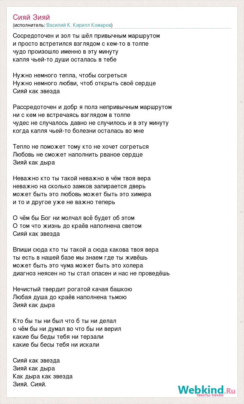 Сосредоточен и зол ты шёл привычным маршрутом и просто встретился взглядом с кем-то в толпе чудо произошло именно в эту минуту капля чьей-то души осталась в тебе Нужно немного тепла, чтобы согреться Нужно немного любви, чтоб открыть своё сердце Сияй как звезда Рассредоточен и добр я полз непривычным маршрутом ни с кем не встречаясь взглядом в толпе чудес не случалось давно не случилось и в эту минуту когда капля чьей-то болезни осталась во мне Тепло не поможет тому кто не хочет согреться Любовь не сможет наполнить рваное сердце Зияй как дыра Неважно кто ты такой неважно в чём твоя вера неважно на сколько замков запирается дверь может быть это любовь может быть это химера и то и другое уже не важно теперь О чём бы Бог ни молчал всё будет об этом О том что жизнь до краёв наполнена светом Сияй как звезда Впиши сюда кто ты такой а сюда какова твоя вера ты есть в нашей базе мы знаем где ты живёшь может быть это чума может быть это холера диагноз неясен но ты стал опасен и нас не проведёшь Нечистый твердит рогатой качая башкою Любая душа до краёв наполнена тьмою Зияй как дыра Кто бы ты ни был что б ты ни делал о чём бы ни думал во что бы ни верил какие бы беды тебя ни терзали какие бы бесы тебя ни искали Сияй как звезда Зияй как дыра Как дыра как звезда Зияй. Сияй.