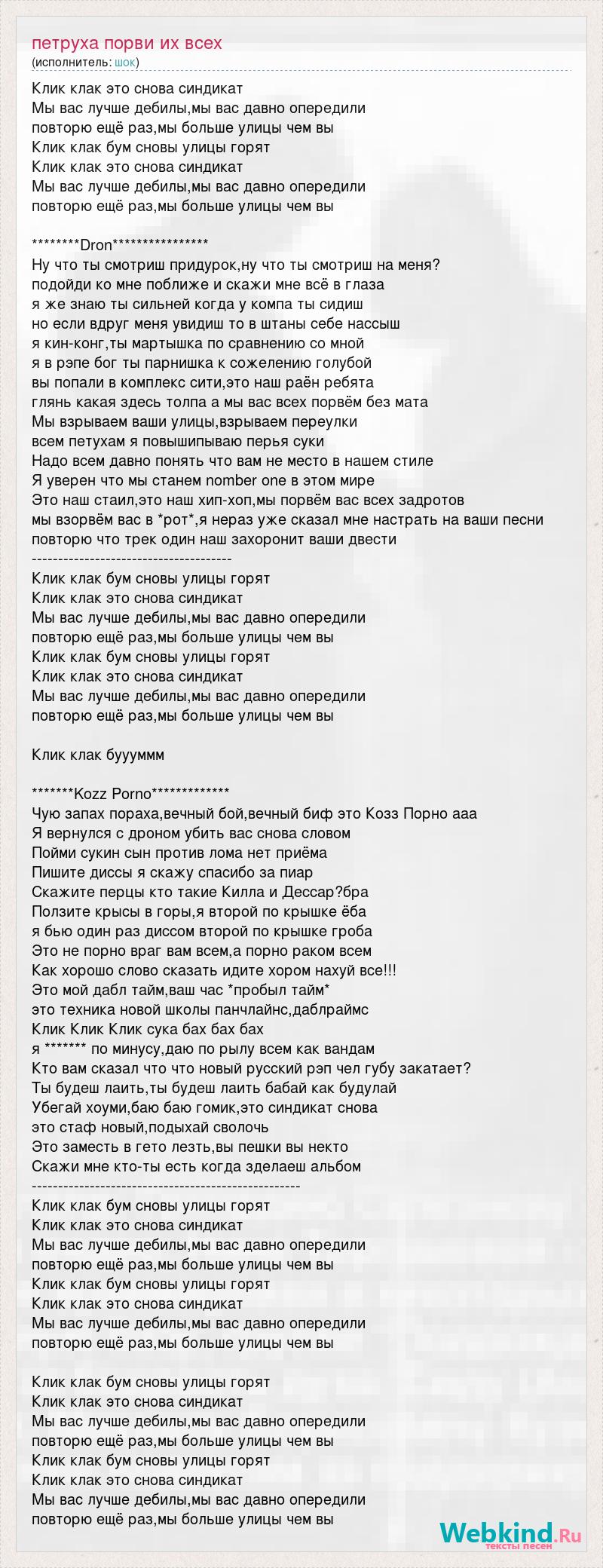 Клик клак это снова синдикат Мы вас лучше дебилы,мы вас давно опередили повторю ещё раз,мы больше улицы чем вы Клик клак бум сновы улицы горят Клик клак это снова синдикат Мы вас лучше дебилы,мы вас давно опередили повторю ещё раз,мы больше улицы чем вы ********Dron**************** Ну что ты смотриш придурок,ну что ты смотриш на меня? подойди ко мне поближе и скажи мне всё в глаза я же знаю ты сильней когда у компа ты сидиш но если вдруг меня увидиш то в штаны себе нассыш я кин-конг,ты мартышка по сравнению со мной я в рэпе бог ты парнишка к сожелению голубой вы попали в комплекс сити,это наш раён ребята глянь какая здесь толпа а мы вас всех порвём без мата Мы взрываем ваши улицы,взрываем переулки всем петухам я повышипываю перья суки Надо всем давно понять что вам не место в нашем стиле Я уверен что мы станем nomber one в этом мире Это наш стаил,это наш хип-хоп,мы порвём вас всех задротов мы взорвём вас в *рот*,я нераз уже сказал мне настрать на ваши песни повторю что трек один наш захоронит ваши двести -------------------------------------- Клик клак бум сновы улицы горят Клик клак это снова синдикат Мы вас лучше дебилы,мы вас давно опередили повторю ещё раз,мы больше улицы чем вы Клик клак бум сновы улицы горят Клик клак это снова синдикат Мы вас лучше дебилы,мы вас давно опередили повторю ещё раз,мы больше улицы чем вы Клик клак буууммм *******Kozz Porno************* Чую запах пораха,вечный бой,вечный биф это Козз Порно ааа Я вернулся с дроном убить вас снова словом Пойми сукин сын против лома нет приёма Пишите диссы я скажу спасибо за пиар Скажите перцы кто такие Килла и Дессар?бра Ползите крысы в горы,я второй по крышке ёба я бью один раз диссом второй по крышке гроба Это не порно враг вам всем,а порно раком всем Как хорошо слово сказать идите хором нахуй все!!! Это мой дабл тайм,ваш час *пробыл тайм* это техника новой школы панчлайнс,даблраймс Клик Клик Клик сука бах бах бах я ******* по минусу,даю по рылу всем как вандам Кто вам сказал что что новый русский рэп чел губу закатает? Ты будеш лаить,ты будеш лаить бабай как будулай Убегай хоуми,баю баю гомик,это синдикат снова это стаф новый,подыхай сволочь Это заместь в гето лезть,вы пешки вы некто Скажи мне кто-ты есть когда зделаеш альбом --------------------------------------------------- Клик клак бум сновы улицы горят Клик клак это снова синдикат Мы вас лучше дебилы,мы вас давно опередили повторю ещё раз,мы больше улицы чем вы Клик клак бум сновы улицы горят Клик клак это снова синдикат Мы вас лучше дебилы,мы вас давно опередили повторю ещё раз,мы больше улицы чем вы Клик клак бум сновы улицы горят Клик клак это снова синдикат Мы вас лучше дебилы,мы вас давно опередили повторю ещё раз,мы больше улицы чем вы Клик клак бум сновы улицы горят Клик клак это снова синдикат Мы вас лучше дебилы,мы вас давно опередили повторю ещё раз,мы больше улицы чем вы