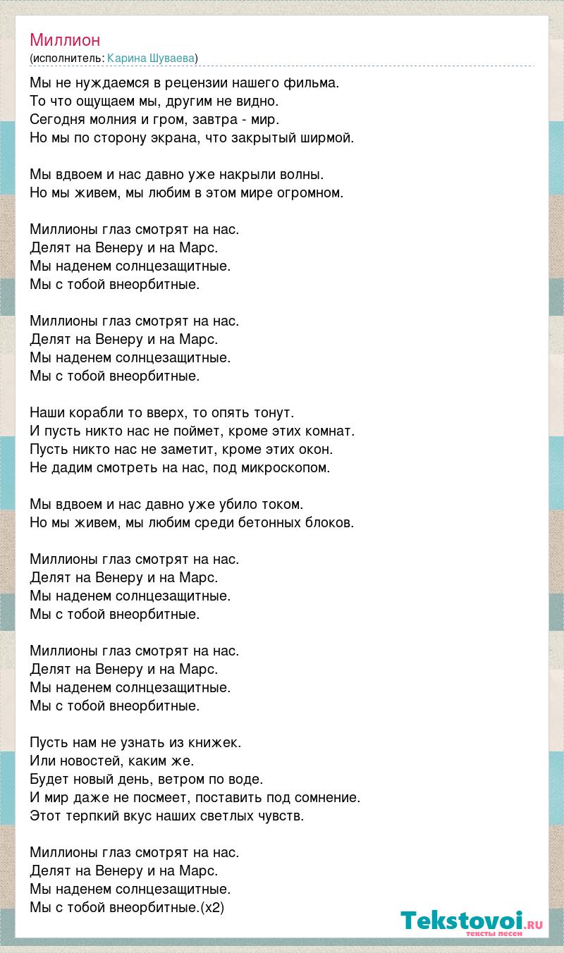 Мы не нуждаемся в рецензии нашего фильма. То что ощущаем мы, другим не видно. Сегодня молния и гром, завтра - мир. Но мы по сторону экрана, что закрытый ширмой. Мы вдвоем и нас давно уже накрыли волны. Но мы живем, мы любим в этом мире огромном. Миллионы глаз смотрят на нас. Делят на Венеру и на Марс. Мы наденем солнцезащитные. Мы с тобой внеорбитные. Миллионы глаз смотрят на нас. Делят на Венеру и на Марс. Мы наденем солнцезащитные. Мы с тобой внеорбитные. Наши корабли то вверх, то опять тонут. И пусть никто нас не поймет, кроме этих комнат. Пусть никто нас не заметит, кроме этих окон. Не дадим смотреть на нас, под микроскопом. Мы вдвоем и нас давно уже убило током. Но мы живем, мы любим среди бетонных блоков. Миллионы глаз смотрят на нас. Делят на Венеру и на Марс. Мы наденем солнцезащитные. Мы с тобой внеорбитные. Миллионы глаз смотрят на нас. Делят на Венеру и на Марс. Мы наденем солнцезащитные. Мы с тобой внеорбитные. Пусть нам не узнать из книжек. Или новостей, каким же. Будет новый день, ветром по воде. И мир даже не посмеет, поставить под сомнение. Этот терпкий вкус наших светлых чувств. Миллионы глаз смотрят на нас. Делят на Венеру и на Марс. Мы наденем солнцезащитные. Мы с тобой внеорбитные.(х2)