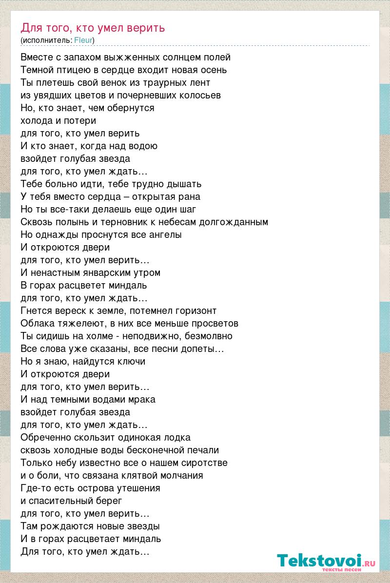 Вместе с запахом выжженных солнцем полей Темной птицею в сердце входит новая осень Ты плетешь свой венок из траурных лент из увядших цветов и почерневших колосьев Но, кто знает, чем обернутся холода и потери для того, кто умел верить И кто знает, когда над водою взойдет голубая звезда для того, кто умел ждать… Тебе больно идти, тебе трудно дышать У тебя вместо сердца – открытая рана Но ты все-таки делаешь еще один шаг Сквозь полынь и терновник к небесам долгожданным Но однажды проснутся все ангелы И откроются двери для того, кто умел верить… И ненастным январским утром В горах расцветет миндаль для того, кто умел ждать… Гнется вереск к земле, потемнел горизонт Облака тяжелеют, в них все меньше просветов Ты сидишь на холме - неподвижно, безмолвно Все слова уже сказаны, все песни допеты… Но я знаю, найдутся ключи И откроются двери для того, кто умел верить… И над темными водами мрака взойдет голубая звезда для того, кто умел ждать… Обреченно скользит одинокая лодка сквозь холодные воды бесконечной печали Только небу известно все о нашем сиротстве и о боли, что связана клятвой молчания Где-то есть острова утешения и спасительный берег для того, кто умел верить… Там рождаются новые звезды И в горах расцветает миндаль Для того, кто умел ждать…