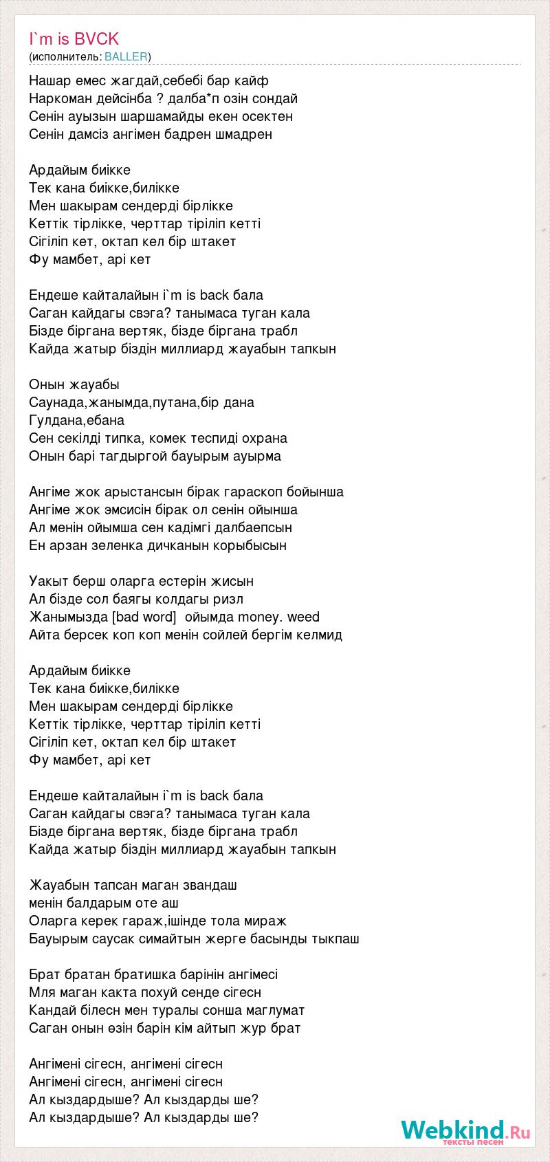Нашар емес жагдай,себебі бар кайф Наркоман дейсінба ? далба*п озін сондай Сенін ауызын шаршамайды екен осектен Сенін дамсіз ангімен бадрен шмадрен Ардайым биікке Тек кана биікке,билікке Мен шакырам сендерді бірлікке Кеттік тірлікке, черттар тіріліп кетті Сігіліп кет, октап кел бір штакет Фу мамбет, арі кет Ендеше кайталайын i`m is back бала Саган кайдагы свэга? танымаса туган кала Бізде біргана вертяк, бізде біргана трабл Кайда жатыр біздін миллиард жауабын тапкын Онын жауабы Саунада,жанымда,путана,бір дана Гулдана,ебана Сен секілді типка, комек теспиді охрана Онын барі тагдыргой бауырым ауырма Ангіме жок арыстансын бірак гараскоп бойынша Ангіме жок эмсисін бірак ол сенін ойынша Ал менін ойымша сен кадімгі далбаепсын Ен арзан зеленка дичканын корыбысын Уакыт берш оларга естерін жисын Ал бізде сол баягы колдагы ризл Жанымызда [bad word] ойымда money. weed Айта берсек коп коп менін сойлей бергім келмид Ардайым биікке Тек кана биікке,билікке Мен шакырам сендерді бірлікке Кеттік тірлікке, черттар тіріліп кетті Сігіліп кет, октап кел бір штакет Фу мамбет, арі кет Ендеше кайталайын i`m is back бала Саган кайдагы свэга? танымаса туган кала Бізде біргана вертяк, бізде біргана трабл Кайда жатыр біздін миллиард жауабын тапкын Жауабын тапсан маган звандаш менін балдарым оте аш Оларга керек гараж,ішінде тола мираж Бауырым саусак симайтын жерге басынды тыкпаш Брат братан братишка барінін ангімесі Мля маган какта похуй сенде сігесн Кандай білесн мен туралы сонша маглумат Саган онын өзін барін кім айтып жур брат Ангімені сігесн, ангімені сігесн Ангімені сігесн, ангімені сігесн Ал кыздардыше? Ал кыздарды ше? Ал кыздардыше? Ал кыздарды ше?