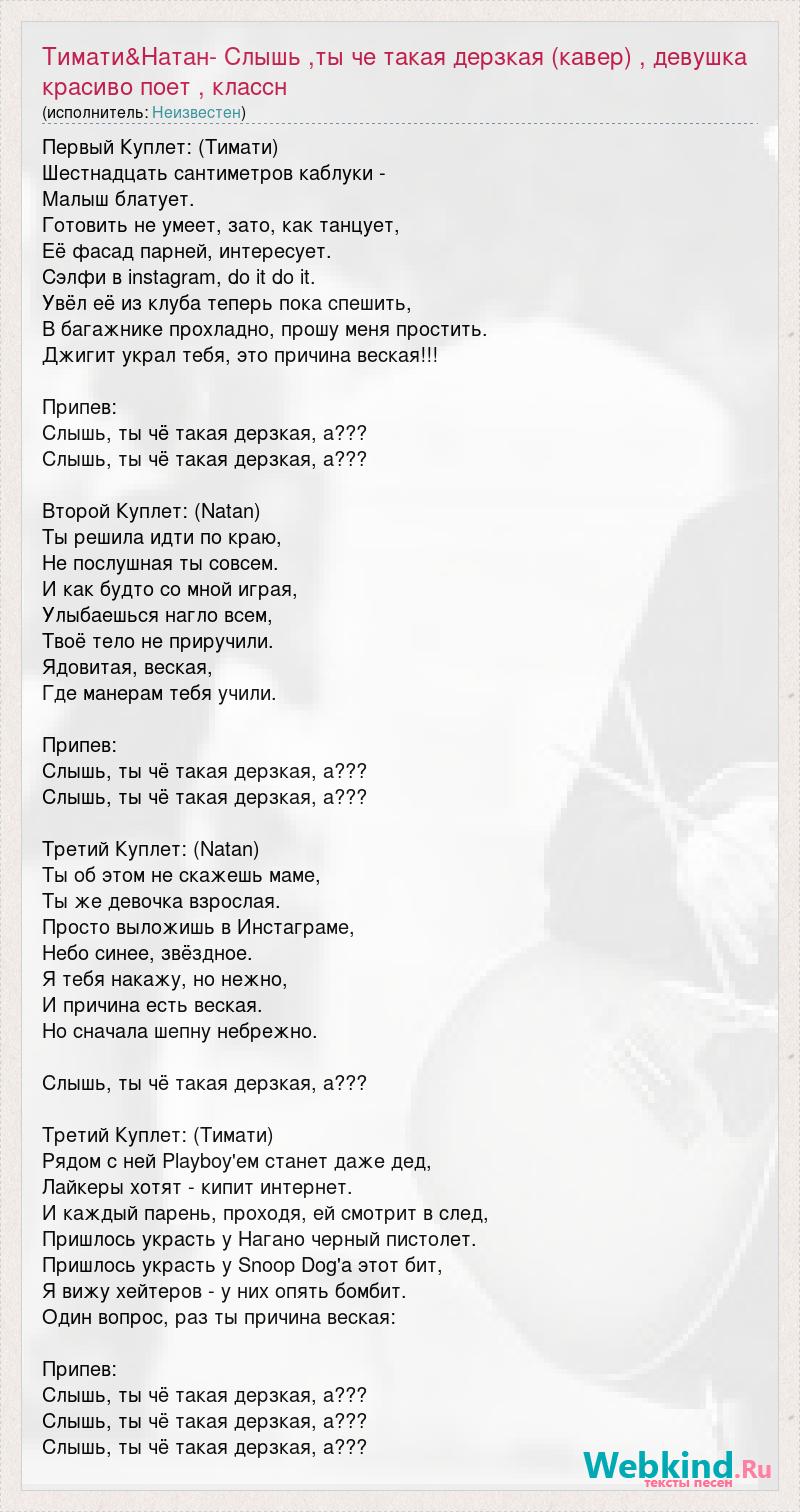 Первый Куплет: (Тимати) Шестнадцать сантиметров каблуки - Малыш блатует. Готовить не умеет, зато, как танцует, Её фасад парней, интересует. Сэлфи в instagram, do it do it. Увёл её из клуба теперь пока спешить, В багажнике прохладно, прошу меня простить. Джигит украл тебя, это причина веская!!! Припев: Слышь, ты чё такая дерзкая, а??? Слышь, ты чё такая дерзкая, а??? Второй Куплет: (Natan) Ты решила идти по краю, Не послушная ты совсем. И как будто со мной играя, Улыбаешься нагло всем, Твоё тело не приручили. Ядовитая, веская, Где манерам тебя учили. Припев: Слышь, ты чё такая дерзкая, а??? Слышь, ты чё такая дерзкая, а??? Третий Куплет: (Natan) Ты об этом не скажешь маме, Ты же девочка взрослая. Просто выложишь в Инстаграме, Небо синее, звёздное. Я тебя накажу, но нежно, И причина есть веская. Но сначала шепну небрежно. Слышь, ты чё такая дерзкая, а??? Третий Куплет: (Тимати) Рядом с ней Playboy'ем станет даже дед, Лайкеры хотят - кипит интернет. И каждый парень, проходя, ей смотрит в след, Пришлось украсть у Нагано черный пистолет. Пришлось украсть у Snoop Dog'а этот бит, Я вижу хейтеров - у них опять бомбит. Один вопрос, раз ты причина веская: Припев: Слышь, ты чё такая дерзкая, а??? Слышь, ты чё такая дерзкая, а??? Слышь, ты чё такая дерзкая, а???