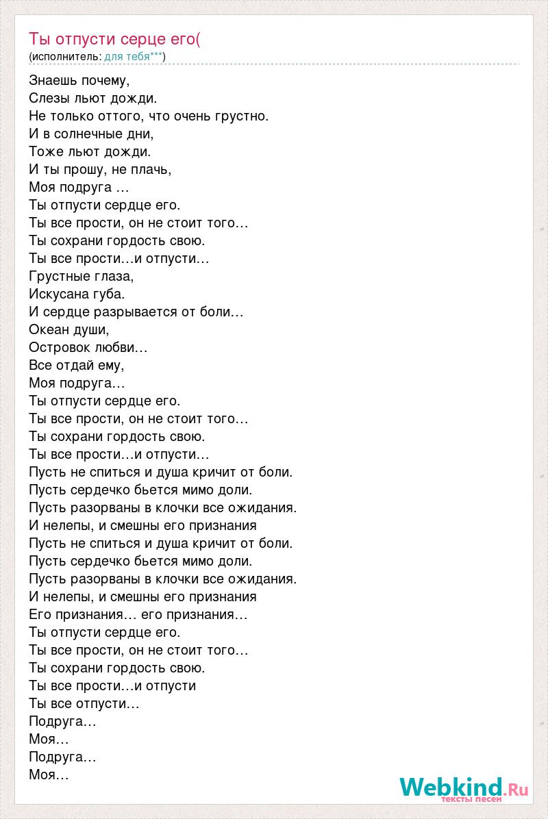 Знаешь почему, Слезы льют дожди. Не только оттого, что очень грустно. И в солнечные дни, Тоже льют дожди. И ты прошу, не плачь, Моя подруга … Ты отпусти сердце его. Ты все прости, он не стоит того… Ты сохрани гордость свою. Ты все прости…и отпусти… Грустные глаза, Искусана губа. И сердце разрывается от боли… Океан души, Островок любви… Все отдай ему, Моя подруга… Ты отпусти сердце его. Ты все прости, он не стоит того… Ты сохрани гордость свою. Ты все прости…и отпусти… Пусть не спиться и душа кричит от боли. Пусть сердечко бьется мимо доли. Пусть разорваны в клочки все ожидания. И нелепы, и смешны его признания Пусть не спиться и душа кричит от боли. Пусть сердечко бьется мимо доли. Пусть разорваны в клочки все ожидания. И нелепы, и смешны его признания Его признания… его признания… Ты отпусти сердце его. Ты все прости, он не стоит того… Ты сохрани гордость свою. Ты все прости…и отпусти Ты все отпусти… Подруга… Моя… Подруга… Моя…