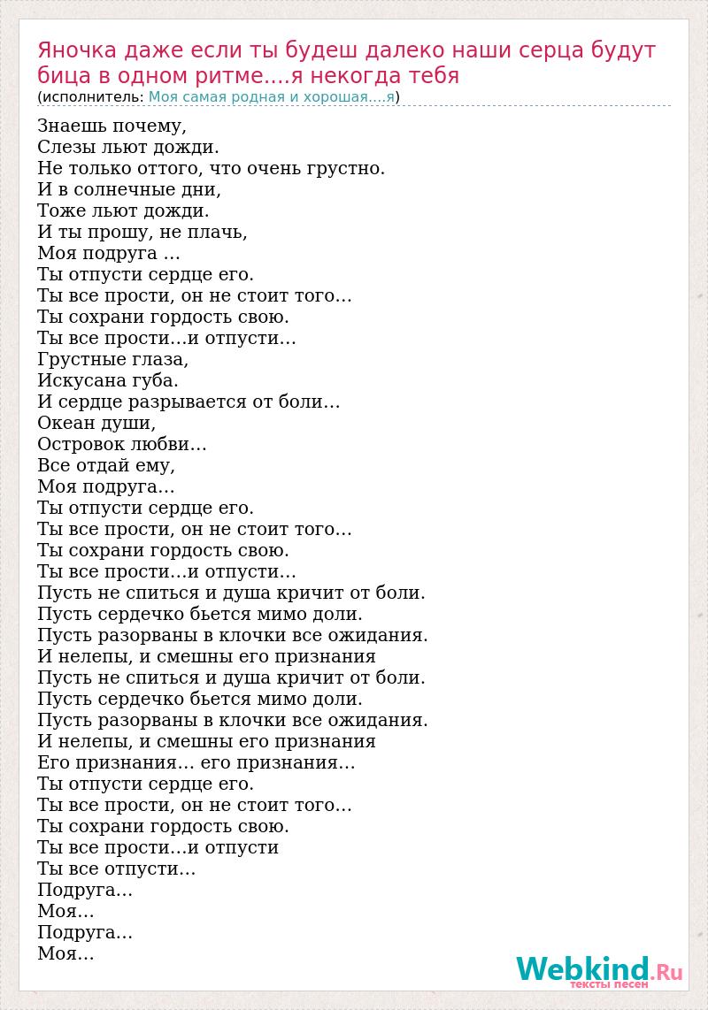 Знаешь почему, Слезы льют дожди. Не только оттого, что очень грустно. И в солнечные дни, Тоже льют дожди. И ты прошу, не плачь, Моя подруга … Ты отпусти сердце его. Ты все прости, он не стоит того… Ты сохрани гордость свою. Ты все прости…и отпусти… Грустные глаза, Искусана губа. И сердце разрывается от боли… Океан души, Островок любви… Все отдай ему, Моя подруга… Ты отпусти сердце его. Ты все прости, он не стоит того… Ты сохрани гордость свою. Ты все прости…и отпусти… Пусть не спиться и душа кричит от боли. Пусть сердечко бьется мимо доли. Пусть разорваны в клочки все ожидания. И нелепы, и смешны его признания Пусть не спиться и душа кричит от боли. Пусть сердечко бьется мимо доли. Пусть разорваны в клочки все ожидания. И нелепы, и смешны его признания Его признания… его признания… Ты отпусти сердце его. Ты все прости, он не стоит того… Ты сохрани гордость свою. Ты все прости…и отпусти Ты все отпусти… Подруга… Моя… Подруга… Моя…