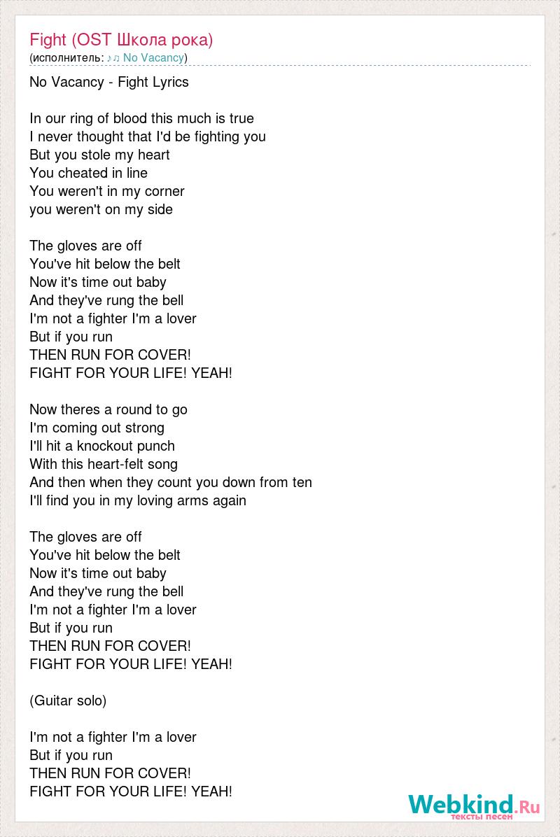 No Vacancy - Fight Lyrics In our ring of blood this much is true I never thought that I'd be fighting you But you stole my heart You cheated in line You weren't in my corner you weren't on my side The gloves are off You've hit below the belt Now it's time out baby And they've rung the bell I'm not a fighter I'm a lover But if you run THEN RUN FOR COVER! FIGHT FOR YOUR LIFE! YEAH! Now theres a round to go I'm coming out strong I'll hit a knockout punch With this heart-felt song And then when they count you down from ten I'll find you in my loving arms again The gloves are off You've hit below the belt Now it's time out baby And they've rung the bell I'm not a fighter I'm a lover But if you run THEN RUN FOR COVER! FIGHT FOR YOUR LIFE! YEAH! (Guitar solo) I'm not a fighter I'm a lover But if you run THEN RUN FOR COVER! FIGHT FOR YOUR LIFE! YEAH!