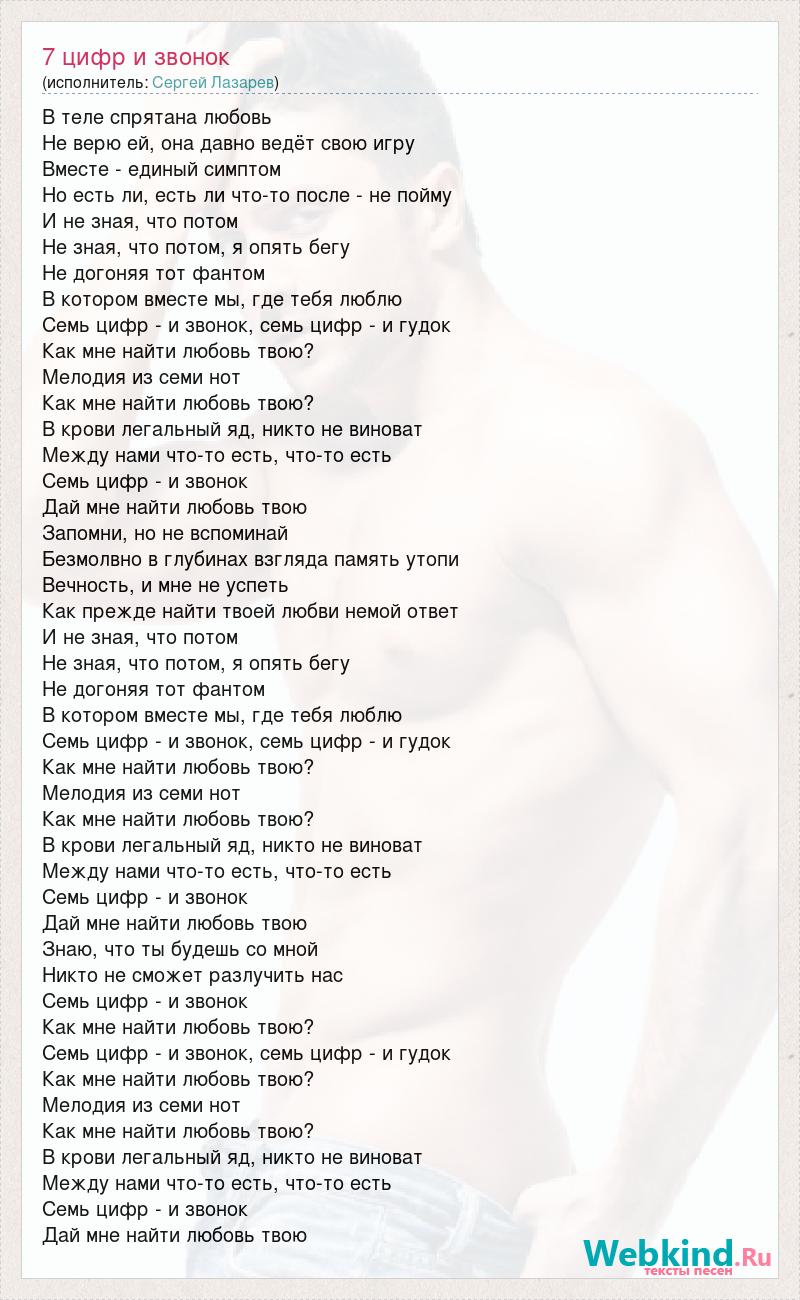 В теле спрятана любовь Не верю ей, она давно ведёт свою игру Вместе - единый симптом Но есть ли, есть ли что-то после - не пойму И не зная, что потом Не зная, что потом, я опять бегу Не догоняя тот фантом В котором вместе мы, где тебя люблю Семь цифр - и звонок, семь цифр - и гудок Как мне найти любовь твою? Мелодия из семи нот Как мне найти любовь твою? В крови легальный яд, никто не виноват Между нами что-то есть, что-то есть Семь цифр - и звонок Дай мне найти любовь твою Запомни, но не вспоминай Безмолвно в глубинах взгляда память утопи Вечность, и мне не успеть Как прежде найти твоей любви немой ответ И не зная, что потом Не зная, что потом, я опять бегу Не догоняя тот фантом В котором вместе мы, где тебя люблю Семь цифр - и звонок, семь цифр - и гудок Как мне найти любовь твою? Мелодия из семи нот Как мне найти любовь твою? В крови легальный яд, никто не виноват Между нами что-то есть, что-то есть Семь цифр - и звонок Дай мне найти любовь твою Знаю, что ты будешь со мной Никто не сможет разлучить нас Семь цифр - и звонок Как мне найти любовь твою? Семь цифр - и звонок, семь цифр - и гудок Как мне найти любовь твою? Мелодия из семи нот Как мне найти любовь твою? В крови легальный яд, никто не виноват Между нами что-то есть, что-то есть Семь цифр - и звонок Дай мне найти любовь твою