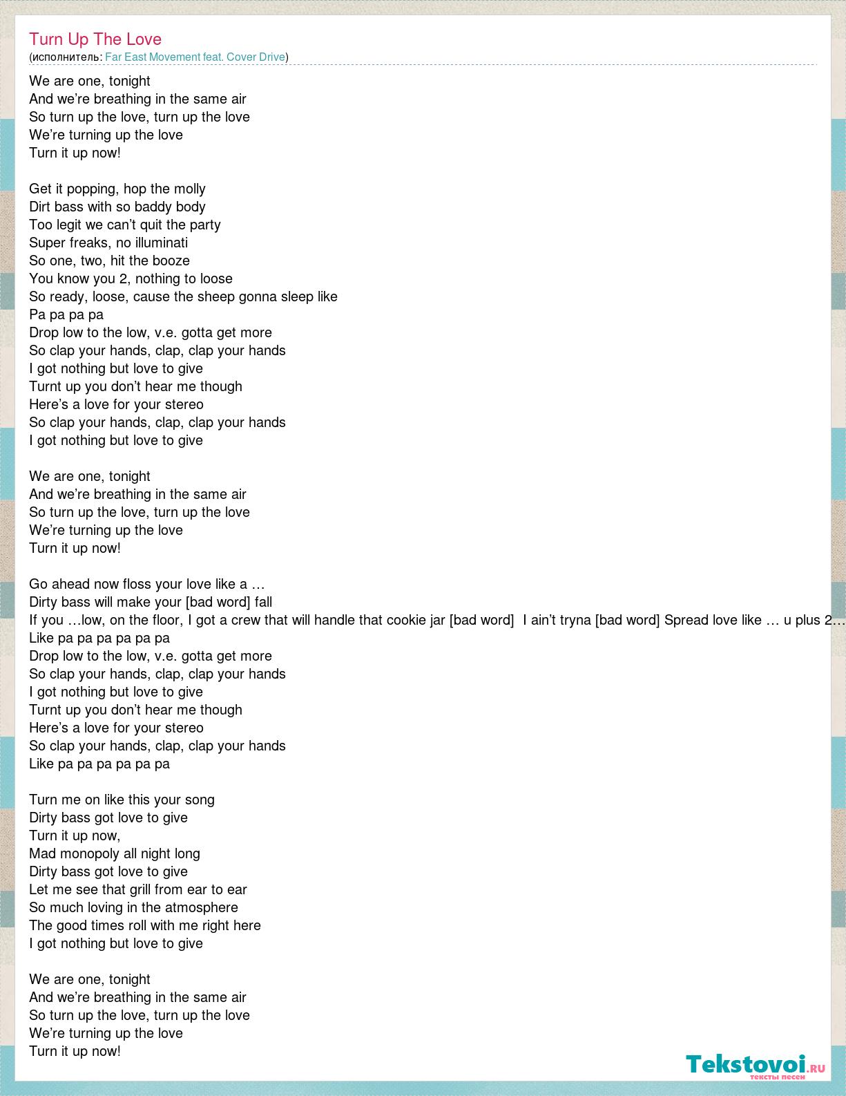 We are one, tonight And we’re breathing in the same air So turn up the love, turn up the love We’re turning up the love Turn it up now! Get it popping, hop the molly Dirt bass with so baddy body Too legit we can’t quit the party Super freaks, no illuminati So one, two, hit the booze You know you 2, nothing to loose So ready, loose, cause the sheep gonna sleep like Pa pa pa pa Drop low to the low, v.e. gotta get more So clap your hands, clap, clap your hands I got nothing but love to give Turnt up you don’t hear me though Here’s a love for your stereo So clap your hands, clap, clap your hands I got nothing but love to give We are one, tonight And we’re breathing in the same air So turn up the love, turn up the love We’re turning up the love Turn it up now! Go ahead now floss your love like a … Dirty bass will make your [bad word] fall If you …low, on the floor, I got a crew that will handle that cookie jar [bad word] I ain’t tryna be rude Spread love like … u plus 2… Like pa pa pa pa pa pa Drop low to the low, v.e. gotta get more So clap your hands, clap, clap your hands I got nothing but love to give Turnt up you don’t hear me though Here’s a love for your stereo So clap your hands, clap, clap your hands Like pa pa pa pa pa pa Turn me on like this your song Dirty bass got love to give Turn it up now, Mad monopoly all night long Dirty bass got love to give Let me see that grill from ear to ear So much loving in the atmosphere The good times roll with me right here I got nothing but love to give We are one, tonight And we’re breathing in the same air So turn up the love, turn up the love We’re turning up the love Turn it up now!