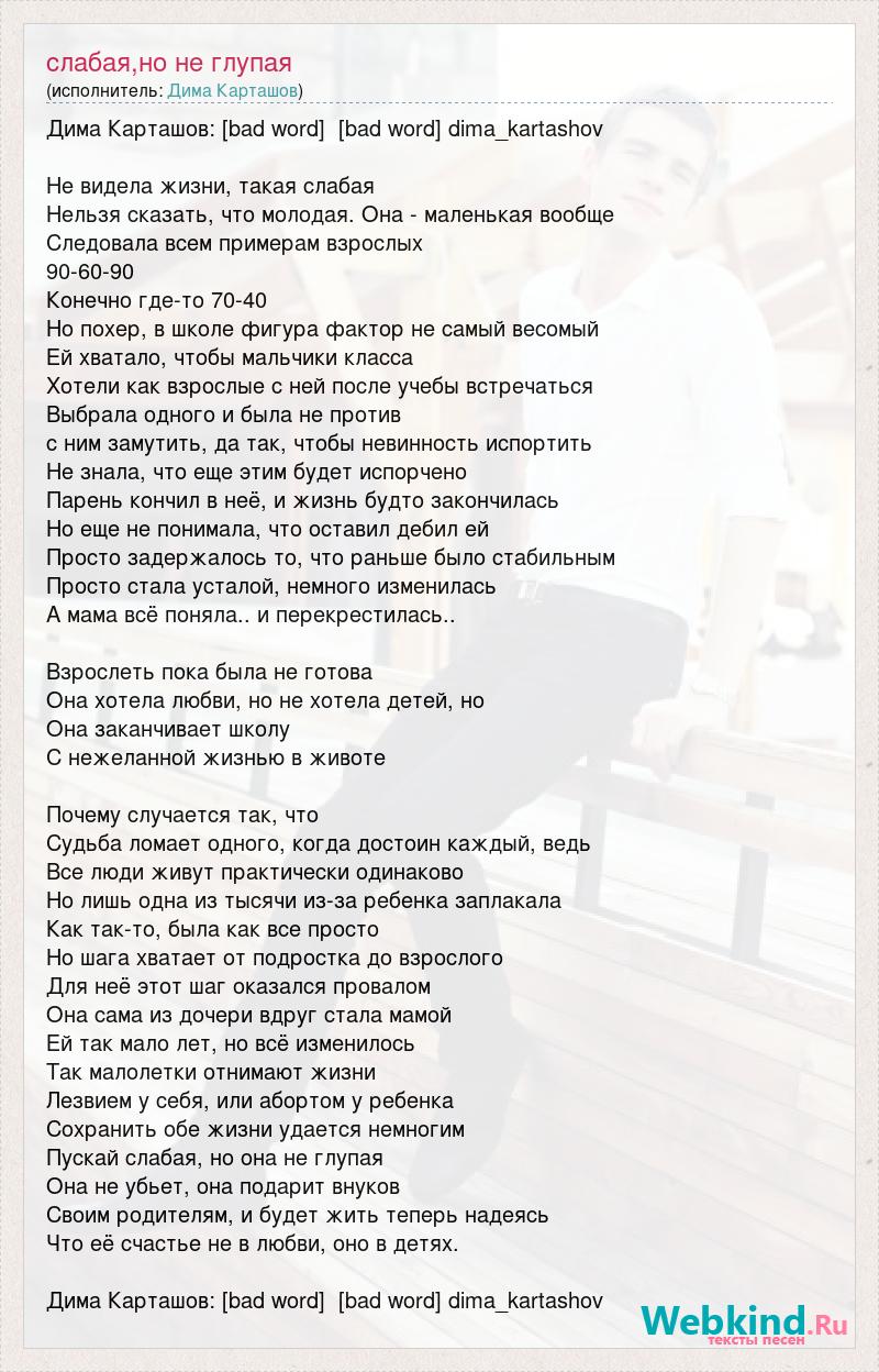 Дима Карташов: [bad word] [bad word] dima_kartashov Не видела жизни, такая слабая Нельзя сказать, что молодая. Она - маленькая вообще Следовала всем примерам взрослых 90-60-90 Конечно где-то 70-40 Но похер, в школе фигура фактор не самый весомый Ей хватало, чтобы мальчики класса Хотели как взрослые с ней после учебы встречаться Выбрала одного и была не против с ним замутить, да так, чтобы невинность испортить Не знала, что еще этим будет испорчено Парень кончил в неё, и жизнь будто закончилась Но еще не понимала, что оставил дебил ей Просто задержалось то, что раньше было стабильным Просто стала усталой, немного изменилась А мама всё поняла.. и перекрестилась.. Взрослеть пока была не готова Она хотела любви, но не хотела детей, но Она заканчивает школу С нежеланной жизнью в животе Почему случается так, что Судьба ломает одного, когда достоин каждый, ведь Все люди живут практически одинаково Но лишь одна из тысячи из-за ребенка заплакала Как так-то, была как все просто Но шага хватает от подростка до взрослого Для неё этот шаг оказался провалом Она сама из дочери вдруг стала мамой Ей так мало лет, но всё изменилось Так малолетки отнимают жизни Лезвием у себя, или абортом у ребенка Сохранить обе жизни удается немногим Пускай слабая, но она не глупая Она не убьет, она подарит внуков Своим родителям, и будет жить теперь надеясь Что её счастье не в любви, оно в детях. Дима Карташов: [bad word] [bad word] dima_kartashov