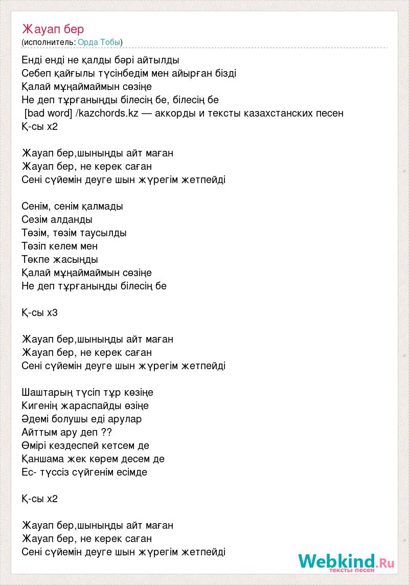 Енді енді не қалды бәрі айтылды Себеп қайғылы түсінбедім мен айырған бізді Қалай мұңаймаймын сөзіңе Не деп тұрғаныңды білесің бе, білесің бе [bad word] /kazchords.kz — аккорды и тексты казахстанских песен Қ-сы х2 Жауап бер,шыныңды айт маған Жауап бер, не керек саған Сені сүйемін деуге шын жүрегім жетпейді Сенім, сенім қалмады Сезім алданды Төзім, төзім таусылды Төзіп келем мен Төкпе жасыңды Қалай мұңаймаймын сөзіңе Не деп тұрғаныңды білесің бе Қ-сы х3 Жауап бер,шыныңды айт маған Жауап бер, не керек саған Сені сүйемін деуге шын жүрегім жетпейді Шаштарың түсіп тұр көзіңе Кигенің жараспайды өзіңе Әдемі болушы еді арулар Айттым ару деп ?? Өмірі кездеспей кетсем де Қаншама жек көрем десем де Ес- түссіз сүйгенім есімде Қ-сы х2 Жауап бер,шыныңды айт маған Жауап бер, не керек саған Сені сүйемін деуге шын жүрегім жетпейді