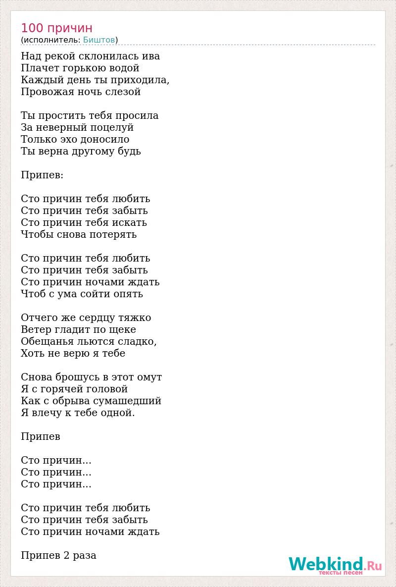 Над рекой склонилась ива Плачет горькою водой Каждый день ты приходила, Провожая ночь слезой Ты простить тебя просила За неверный поцелуй Только эхо доносило Ты верна другому будь Припев: Сто причин тебя любить Сто причин тебя забыть Сто причин тебя искать Чтобы снова потерять Сто причин тебя любить Сто причин тебя забыть Сто причин ночами ждать Чтоб с ума сойти опять Отчего же сердцу тяжко Ветер гладит по щеке Обещанья льются сладко, Хоть не верю я тебе Снова брошусь в этот омут Я с горячей головой Как с обрыва сумашедший Я влечу к тебе одной. Припев Сто причин... Сто причин... Сто причин... Сто причин тебя любить Сто причин тебя забыть Сто причин ночами ждать Припев 2 раза