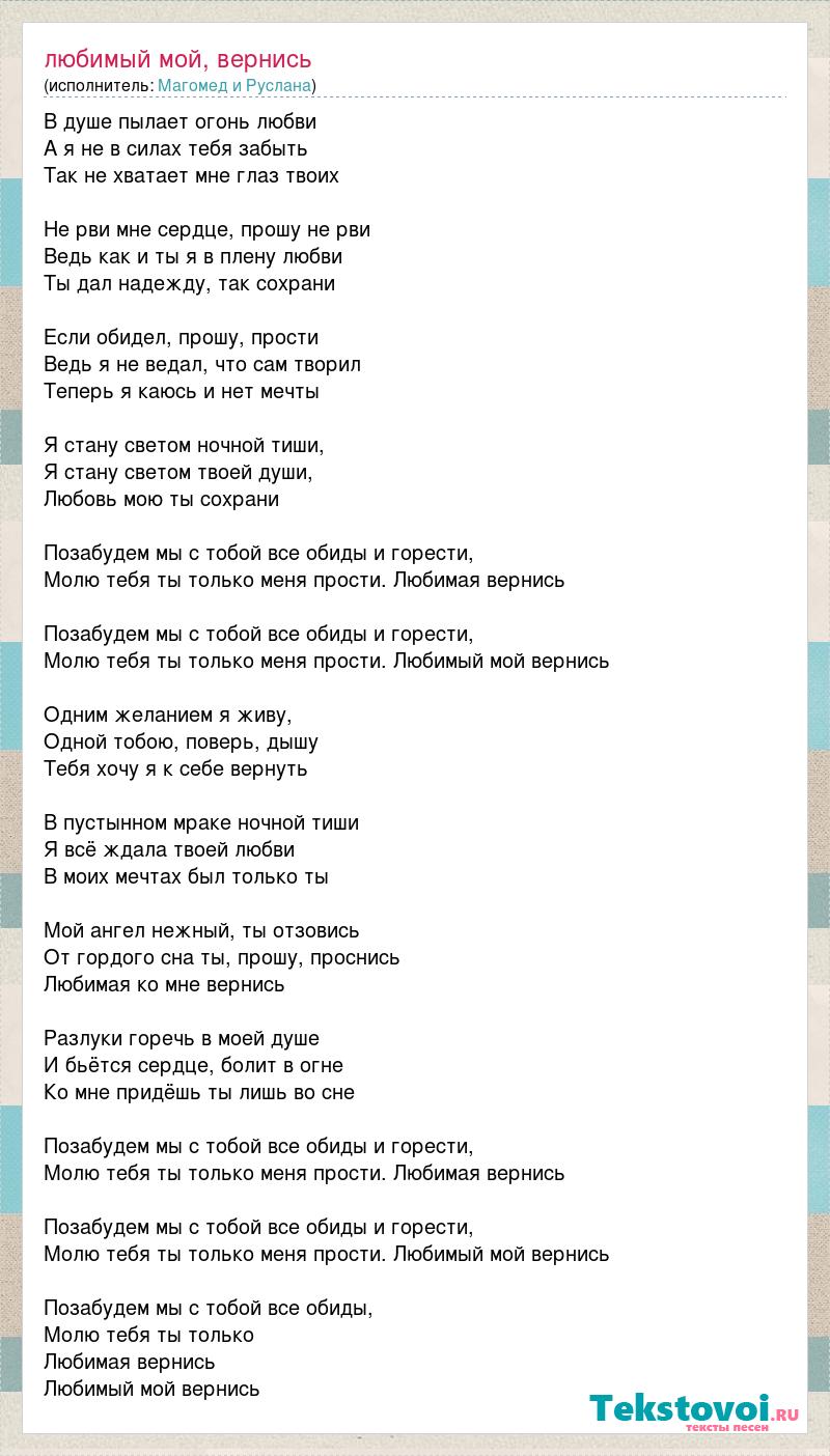 В душе пылает огонь любви А я не в силах тебя забыть Так не хватает мне глаз твоих Не рви мне сердце, прошу не рви Ведь как и ты я в плену любви Ты дал надежду, так сохрани Если обидел, прошу, прости Ведь я не ведал, что сам творил Теперь я каюсь и нет мечты Я стану светом ночной тиши, Я стану светом твоей души, Любовь мою ты сохрани Позабудем мы с тобой все обиды и горести, Молю тебя ты только меня прости. Любимая вернись Позабудем мы с тобой все обиды и горести, Молю тебя ты только меня прости. Любимый мой вернись Одним желанием я живу, Одной тобою, поверь, дышу Тебя хочу я к себе вернуть В пустынном мраке ночной тиши Я всё ждала твоей любви В моих мечтах был только ты Мой ангел нежный, ты отзовись От гордого сна ты, прошу, проснись Любимая ко мне вернись Разлуки горечь в моей душе И бьётся сердце, болит в огне Ко мне придёшь ты лишь во сне Позабудем мы с тобой все обиды и горести, Молю тебя ты только меня прости. Любимая вернись Позабудем мы с тобой все обиды и горести, Молю тебя ты только меня прости. Любимый мой вернись Позабудем мы с тобой все обиды, Молю тебя ты только Любимая вернись Любимый мой вернись