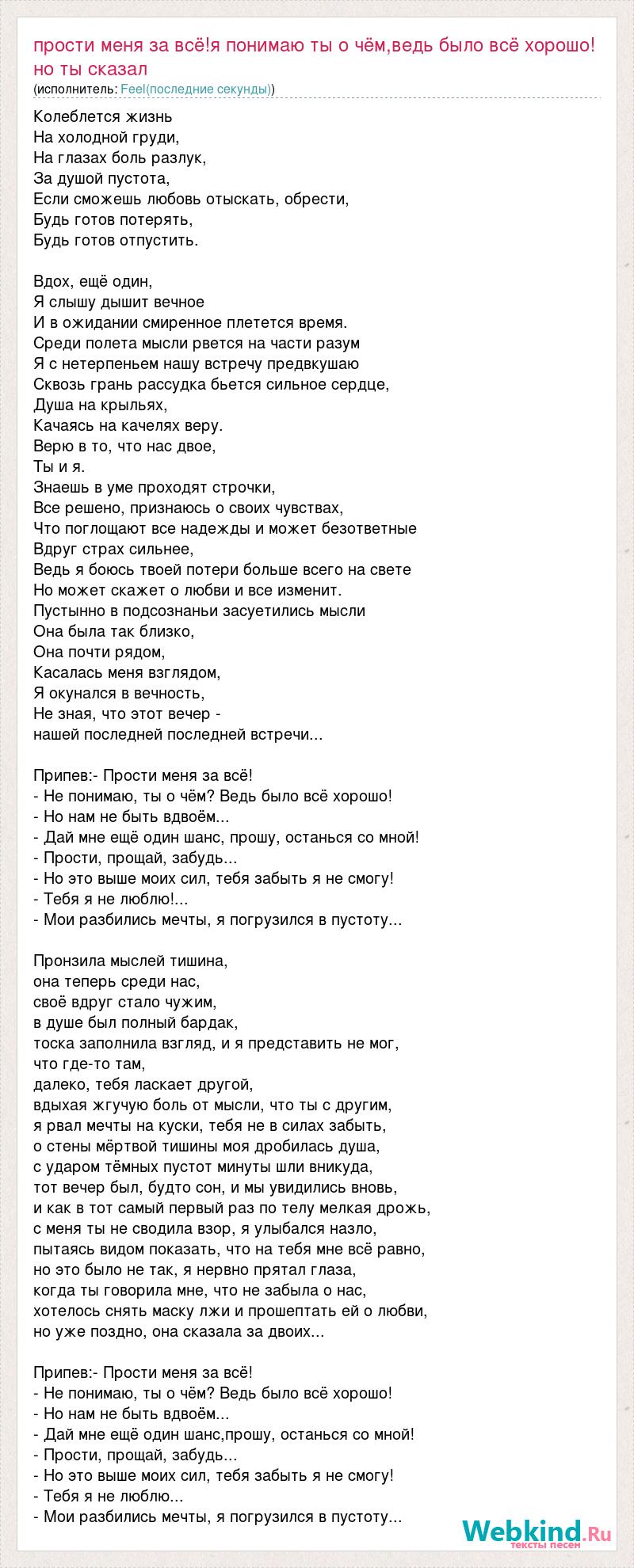 Главная→Исполнители→Feel(последние секунды)→Прости меня за всё!я понимаю ты о чём,ведь было всё хорошо! но ты сказал