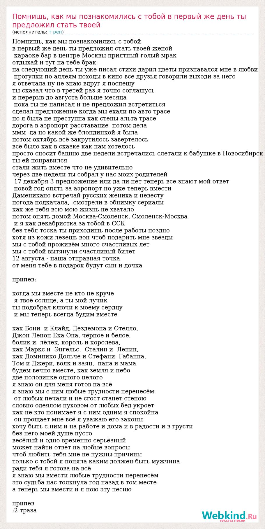 Помнишь, как мы познакомились с тобой в первый же день ты предложил стать твоей женой караоке бар в центре Москвы приятный голый мрак отдыхай и тут на тебе брак на следующий день ты уже писал стихи дарил цветы признавался мне в любви прогулки по аллеям походы в кино все друзья говорили выходи за него я отвечала ну не знаю вдруг я поспешу ты сказал что в третей раз я точно соглашусь и перерыв до августа больше месяца пока ты не написал и не предложил встретиться сделал предложение когда мы ехали по авто трасе но я была не преступна как стены альта трасе дорога в аэропорт расставание потом дела ммм да но какой же блондинкой я была потом октябрь всё закрутилось завертелось всё было как в сказке как нам хотелось просто сносит башню две недели встречались слетали к бабушке в Новосибирск ты ей понравился стали жить вместе что не удивительно через две недели ты собрал у нас моих родителей 17 декабря 3 предложение или да ли нет теперь все знают мой ответ новой год опять за аэропорт но уже теперь вмести Даменикано встречай русских жениха и невесту погода подкачала, смотрели в обнимку сериалы как же тебя всю мою жизнь не хватало потом опять домой Москва-Смоленск, Смоленск-Москва и я как декабристка за тобой в ССК без тебя тоска ты приходишь после работы поздно хотя из кожи лезешь вон чтоб подарить мне звёзды мы с тобой проживём много счастливых лет мы с тобой вытянули счастливый билет 12 августа - наша отправная точка от меня тебе в подарок будут сын и дочка припев: когда мы вместе не кто не круче я твоё солнце, а ты мой лучик ты подобрал ключи к моему сердцу и мы теперь всегда будим вместе как Бони и Клайд, Дездемона и Отелло, Джон Ленон Ека Она, чёрное и белое, болик и лёлек, король и королева, как Маркс и Энгельс, Сталин и Ленин, как Доминико Дольче и Стефани Габанна, Том и Джери, волк и заяц, папа и мама будем вечно вместе, как земля и небо две половинке одного целого я знаю он для меня готов на всё я знаю мы с ним любые трудности перенесём от любых печали и не сгост станет стеною словно одеялом пуховом от любых бед укроет как не кто понимает я с ним одним я спокойна он прощает мне всё я уважаю его законы хочу быть с ним и на работе и дома и в радости и в грусти без него моей душе пусто весёлый и одно временно серьёзный может найти ответ на любые вопросы чтоб любить тебя мне не нужны причины только с тобой я поняла каким должен быть мужчина ради тебя я готова на всё я знаю мы вмести любые трудности перенесём это судьба нас толкнула год назад в том месте а теперь мы вмести и я пою эту песню припев :2 траза