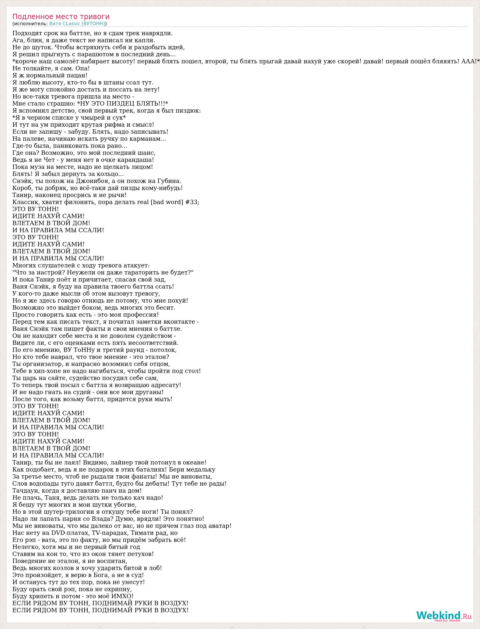 Подходит срок на баттле, но я сдам трек наврядли. Ага, блин, я даже текст не написал ни капли. Не до шуток. Чтобы встряхнуть себя и раздобыть идей, Я решил прыгнуть с парашютом в последний день... *короче наш самолёт набирает высоту! первый блять пошел, второй, ты блять прыгай давай нахуй уже скорей! давай! первый пошёл бляяять! ААА!* Не толкайте, я сам. Опа! Я ж нормальный пацан! Я люблю высоту, кто-то бы в штаны ссал тут. Я же могу спокойно достать и поссать на лету! Но все-таки тревога пришла на место - Мне стало страшно: *НУ ЭТО ПИЗДЕЦ БЛЯТЬ!!!* Я вспомнил детство, свой первый трек, когда я был пиздюк: *Я в черном списке у чмырей и сук* И тут на ум приходит крутая рифма и смысл! Если не запишу - забуду. Блять, надо записывать! На палеве, начинаю искать ручку по карманам... Где-то была, паниковать пока рано... Где она? Возможно, это мой последний шанс, Ведь я не Чет - у меня нет в очке карандаша! Пока муза на месте, надо не щелкать лицом! Блять! Я забыл дернуть за кольцо... Снэйк, ты похож на Джонибоя, а он похож на Губина. Короб, ты добряк, но всё-таки дай пизды кому-нибудь! Танир, наконец просрись и не рычи! Классик, хватит филонить, пора делать real [bad word] #33; ЭТО ВУ ТОНН! ИДИТЕ НАХУЙ САМИ! ВЛЕТАЕМ В ТВОЙ ДОМ! И НА ПРАВИЛА МЫ ССАЛИ! ЭТО ВУ ТОНН! ИДИТЕ НАХУЙ САМИ! ВЛЕТАЕМ В ТВОЙ ДОМ! И НА ПРАВИЛА МЫ ССАЛИ! Многих слушателей с ходу тревога атакует: "Что за настрой? Неужели он даже тараторить не будет?" И пока Танир поёт и причитает, спасая свой зад, Ваня Снэйк, я буду на правила твоего баттла ссать! У кого-то даже мысли об этом вызовут тревогу, Но я же здесь говорю отнюдь не потому, что мне похуй! Возможно это выйдет боком, ведь многих это бесит. Просто говорить как есть - это моя профессия! Перед тем как писать текст, я почитал заметки вконтакте - Ваня Снэйк там пишет факты и свои мнения о баттле. Он не находит себе места и не доволен судейством - Видите ли, с его оценками есть пять несоответствий. По его мнению, ВУ ТоННу и третий раунд - потолок, Но кто тебе наврал, что твое мнение - это эталон? Ты организатор, и напрасно возомнил себя отцом, Тебе в хип-хопе не надо нагибаться, чтобы пройти под стол! Ты царь на сайте, судейство посудил себе сам, То теперь твой посыл с баттла я возвращаю адресату! И не надо гнать на судей - они все мои друганы! После того, как возьму баттл, придется руки мыть! ЭТО ВУ ТОНН! ИДИТЕ НАХУЙ САМИ! ВЛЕТАЕМ В ТВОЙ ДОМ! И НА ПРАВИЛА МЫ ССАЛИ! ЭТО ВУ ТОНН! ИДИТЕ НАХУЙ САМИ! ВЛЕТАЕМ В ТВОЙ ДОМ! И НА ПРАВИЛА МЫ ССАЛИ! Танир, ты бы не лаял! Видимо, лайнер твой потонул в океане! Как подобает, ведь я не подарок в этих баталиях! Бери медальку За третье место, чтоб не рыдали твои фанаты! Мы не виноваты, Слов водопады туго давят баттл, будто бы дебаты! Тут тебе не рады! Тачдаун, когда я доставляю панч на дом! Не плачь, Таня, ведь делать не только кач надо! Я бешу тут многих и мои шутки убогие, Но в этой шутер-трилогии я откушу тебе ноги! Ты понял? Надо ли лапать парня со Влада? Думю, врядли! Это понятно! Мы не виноваты, что мы далеко от вас, но не прячем глаз под аватар! Нас нету на DVD-платах, TV-парадах, Тимати рад, но Его рэп - вата, это по факту, но мы придём забрать всё! Нелегко, хотя мы и не первый битый год Ставим на кон то, что из окон тянет петухов! Поведение не эталон, я не воспитан, Ведь многих козлов я хочу ударить битой в лоб! Это произойдет, я верю в Бога, а не в суд! И останусь тут до тех пор, пока не унесут! Бу
